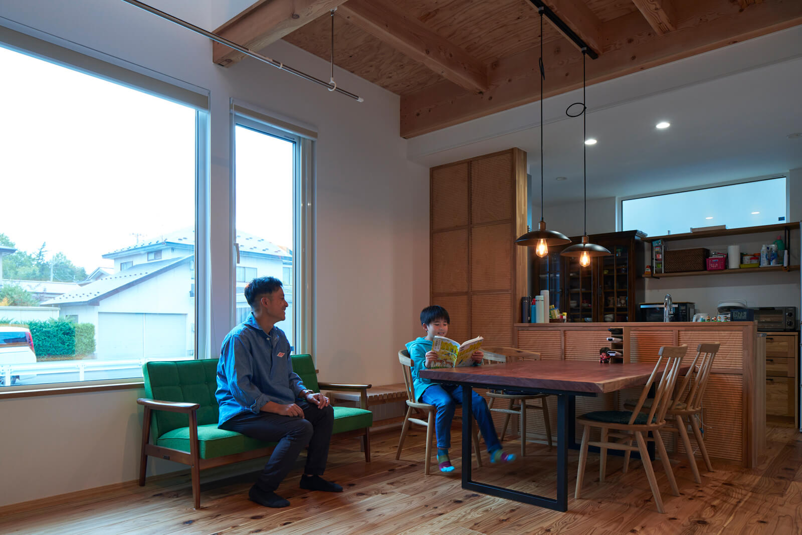 Nさん宅はまず、玄関ドアを開けるといきなり1階全体が見渡せる開放感に驚かされます。トイレ、洗面脱衣所、浴室に通じる出入り口にしか扉はありません。玄関は土間が広めに取られ、靴を脱いだら2ステップで部屋に上がれるようになっています。目を惹くのは、スギの床、マツの梁を始め、天井・柱・壁面に使われたさまざまな表情の木材。ブビンガの一枚板を使った造作のテーブルを主役に、白壁と調和した大きな南窓と吹き抜けの2階の窓、キッチンのスリット窓から入る自然光がやわらかく室内を包み込み、まさに癒やしの空間です。
