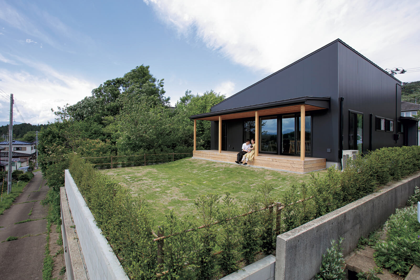 高台の住宅地に立つ、スタイリッシュな佇まいのAさん宅。自然豊かな眺望が楽しめる、おおらかな平屋の室内空間と広々とした庭が印象的な住まいです。「二人ともアウトドアが好きなので、庭のある静かな環境でのびのび暮らしたいと思っていました」とAさん。平屋を希望したのは、「家族がどこにいるか把握しやすく集まりやすいのと、将来歳を取ったときにワンフロアの生活の方が楽だと考えたからです」と、奥さんは語ります。