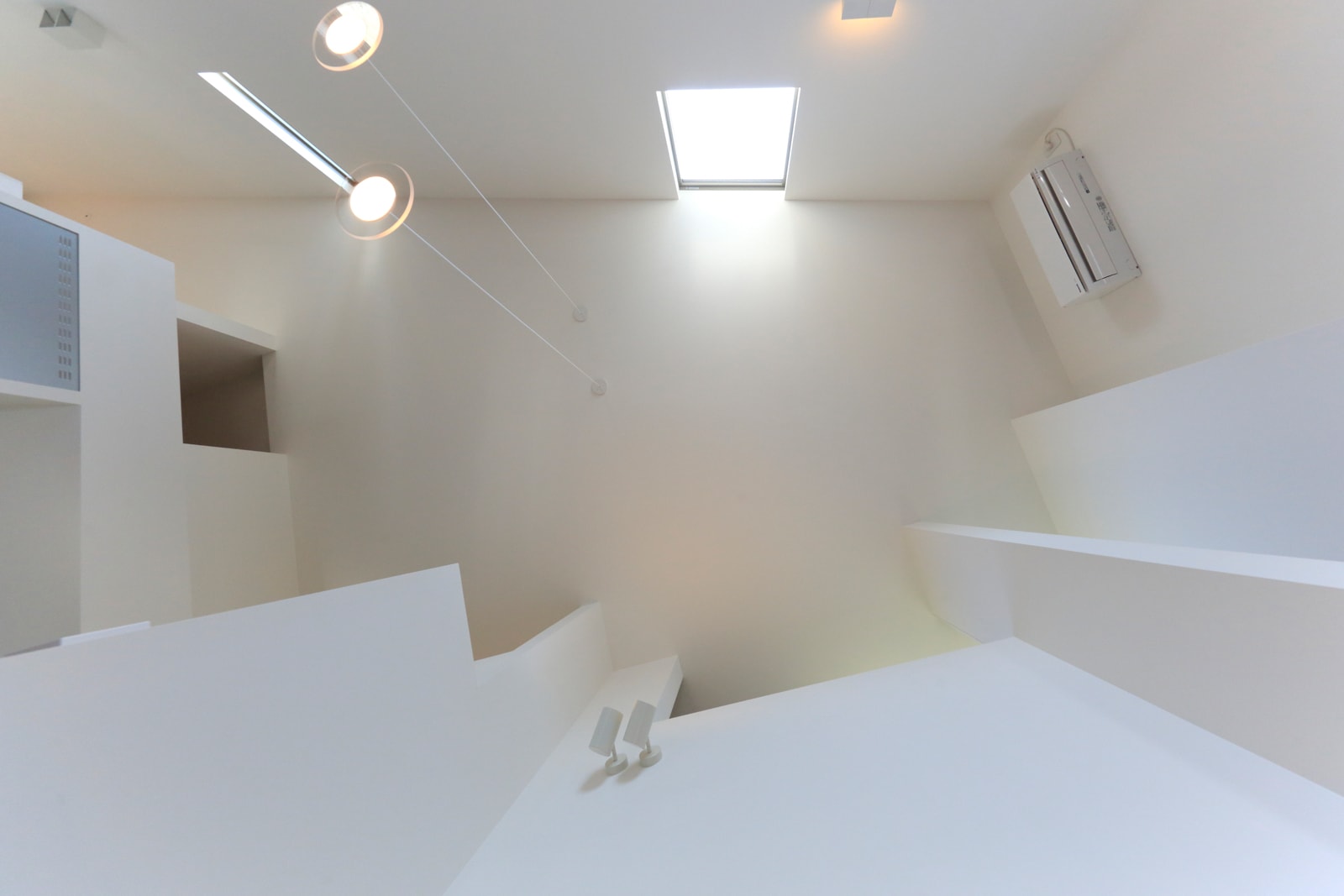 鋭角な三角形の土地に建つYさん宅。限られた予算を考え、スキップフロアとロフトの組み合わせで構成された2階建てとし、車2台分の駐車スペ-スが必要だったため2階にLDKを配置しました。1階には玄関や浴室などの水まわりを配置し、鋭角な三角を利用して物干しのためのサブテラスを設けました。建物の鋭角部分は鉄板を曲げてつくり、それを煙突状に屋根の高さまで伸ばしています が、その特徴的な奥行きのない壁に、通る人は不思議そうに見上げるようです。