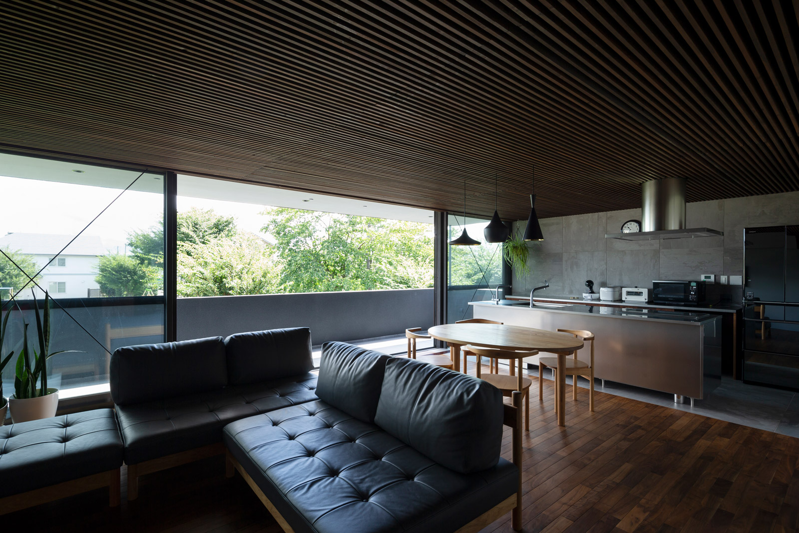 区画された敷地のすぐ隣に並ぶ2階建ての住宅、南と東に面する道路を行き交う車と歩行者。道路をはさんで東側に大きな樹木のある公園。開くべき方向が制限された住宅地において、素直にその制限に従って閉じ・開くことで空間をかたどりました。できあがった空間に立ってみると、水面から少し浮いた甲板に立って公園の緑を眺めているように感じられます。