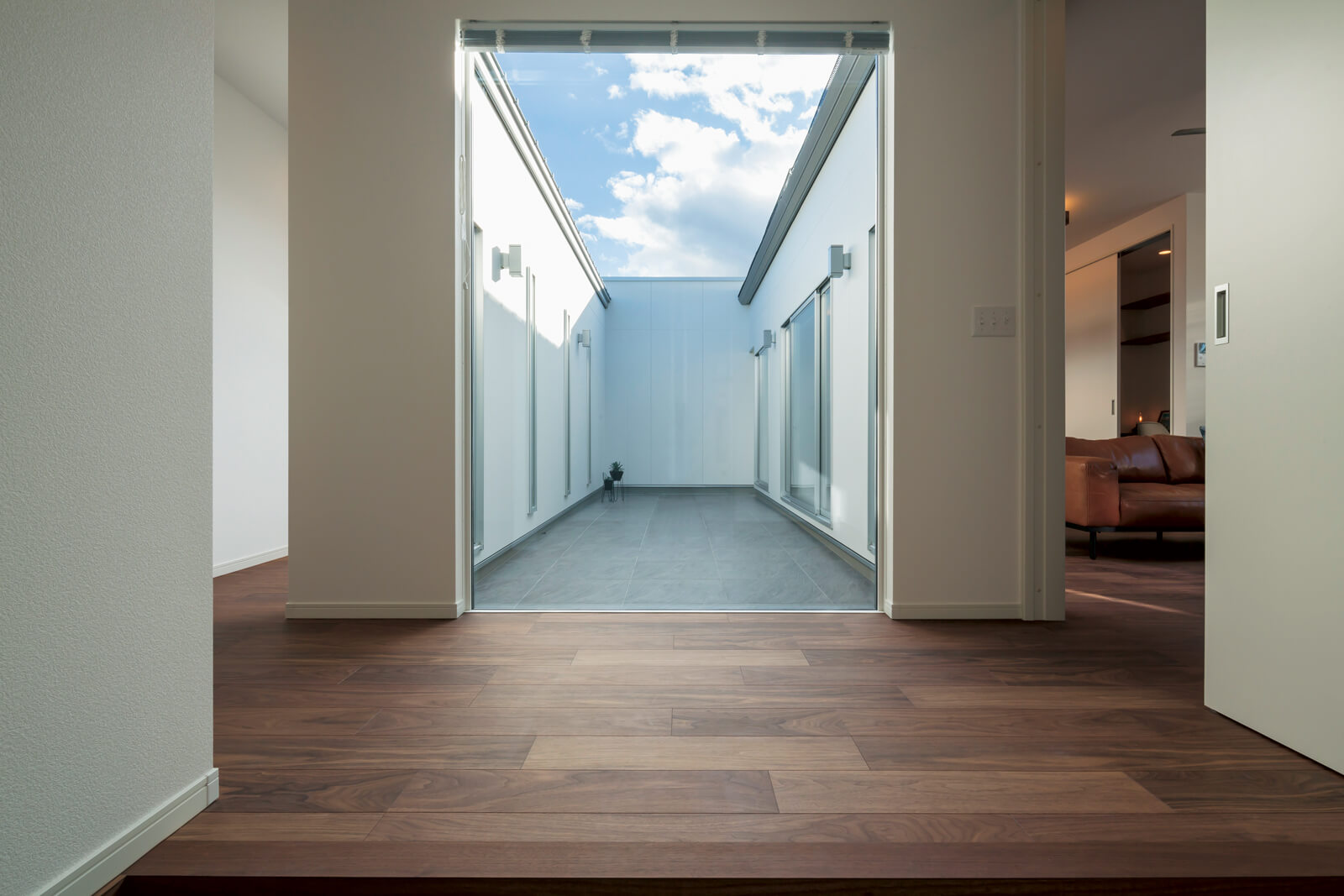 中島村の市街地に建つIさん宅もそのひとつ。住宅街の中でひときわ目を引く洗練されたコートハウスの玄関ドアを開けると、目の前に奥行き約10m、幅2.7mの広い中庭が広がります。白い壁の上には、鮮やかな青空。夜には、星空が眺められる自然を身近に感じるお住まいです。
