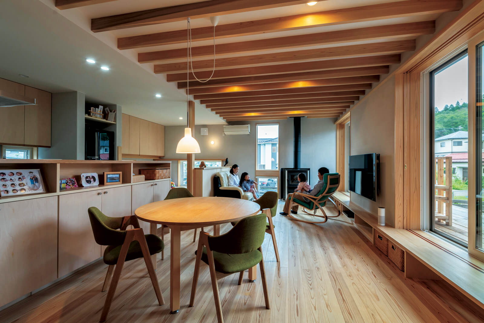 玄関ドアを開けると、連なる梁が印象的なLDKが迎えてくれます。梁とは垂直方向に伸びるスギのフローリングは柔らかく、子どもたちが走り回っても安全で静か。床から30センチ程の高さに設けた掃き出し窓は、ベンチや収納としての機能とともに、シンプルなフロアに変化を付けています。