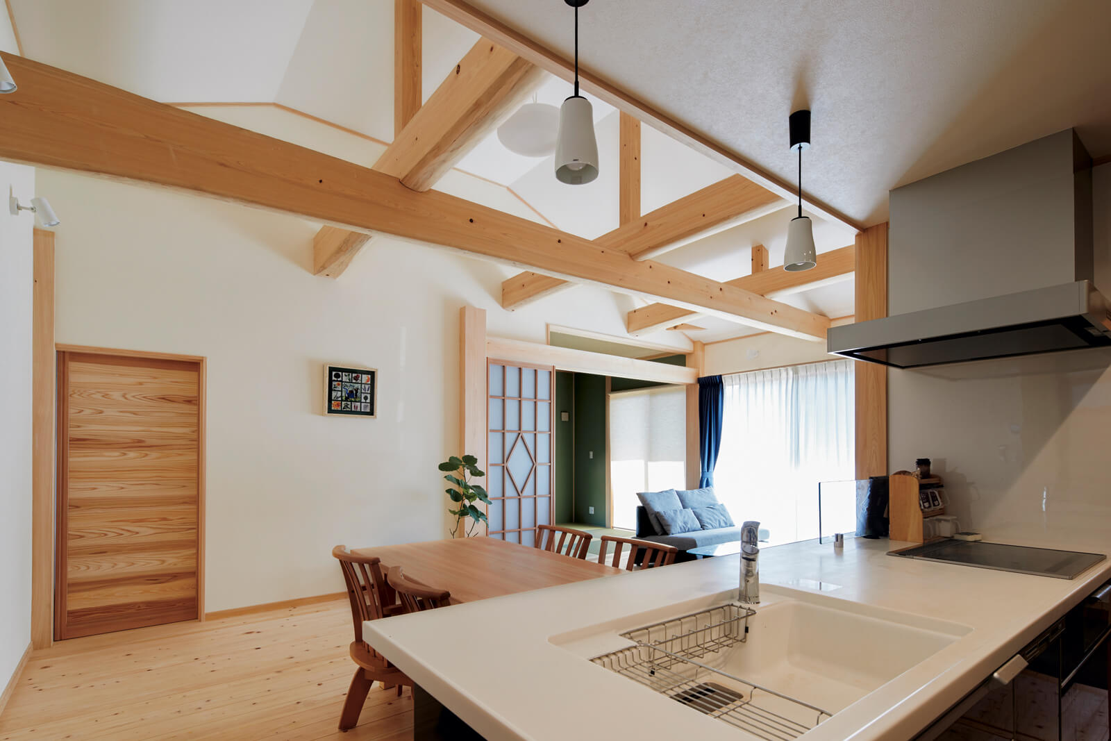 お二人の新居を手がけたタカハシホームは、良質な木を知り尽くした材木店を母体とする工務店です。木のプロとしての目利きを活かし、全国各地の良質な木材を追求してきました。家づくりに使用するのは、宮城県白石市にある約300坪の倉庫の中で、しっかりと天然乾燥させた木材たちです。同社が得意とするのは、強度や耐久性に優れたヒノキをふんだんに取り入れた骨太耐震住宅「檜乃家」です。こちらのKさん宅も、土台、柱、梁、桁にいたるまで贅沢にヒノキを採用した住まいとなっています。