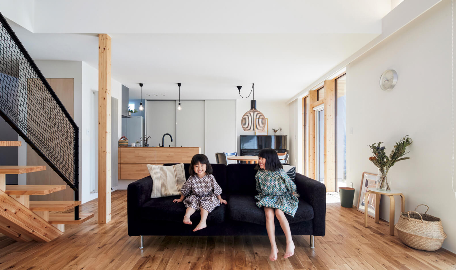 明るいリビングは、吹き抜けと大きな窓によって開放感たっぷり。壁や天井は白で統一され、ナラ材のフローリングや窓枠や階段の白木とも好相性、シンプルで上質な雰囲気を醸しています。印象的なペンダントライトは、Iさんご夫妻が一目惚れして購入したものだとか。