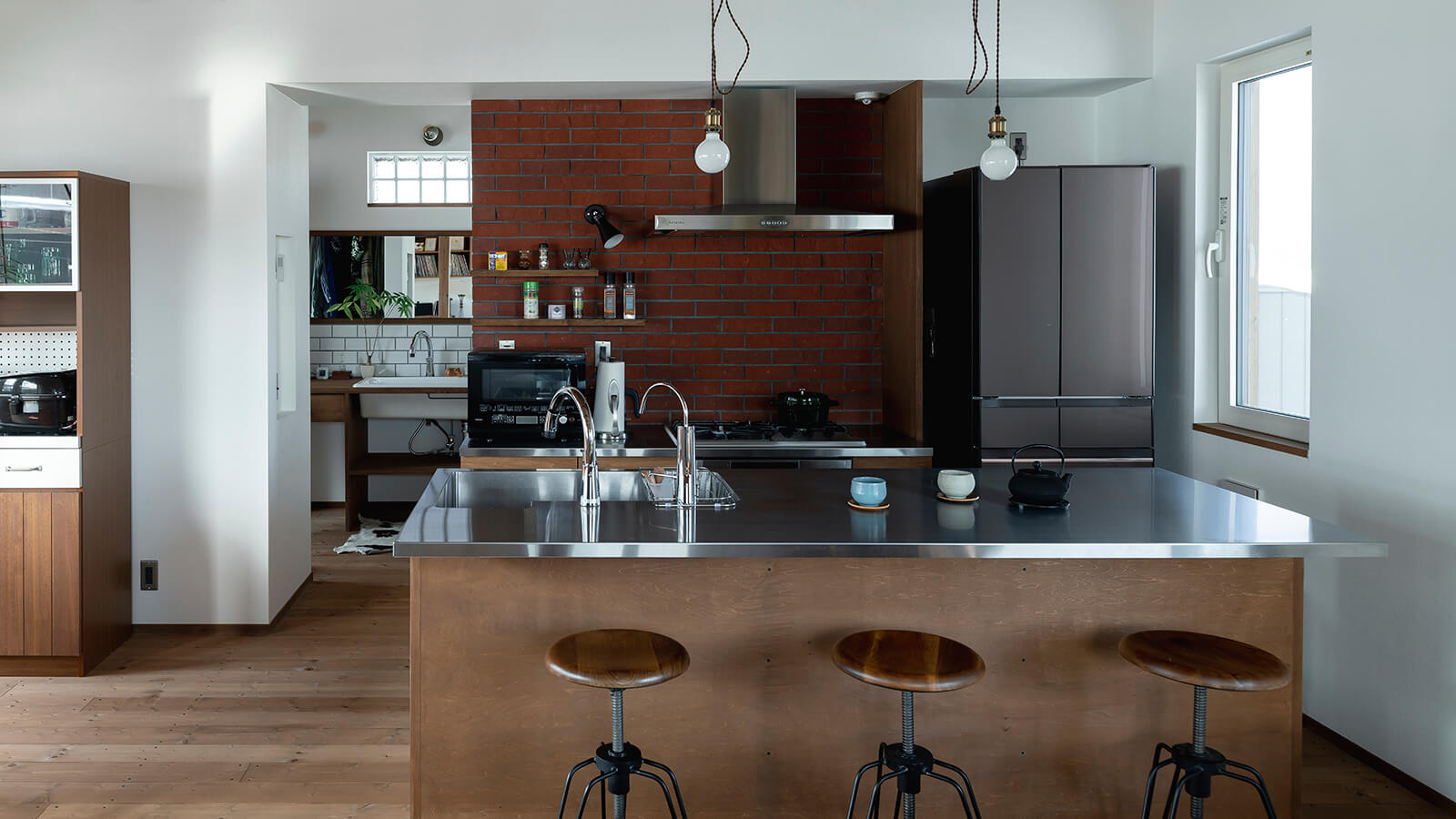 明るくて暖かい。レンガ壁のキッチンがある2階リビングの家