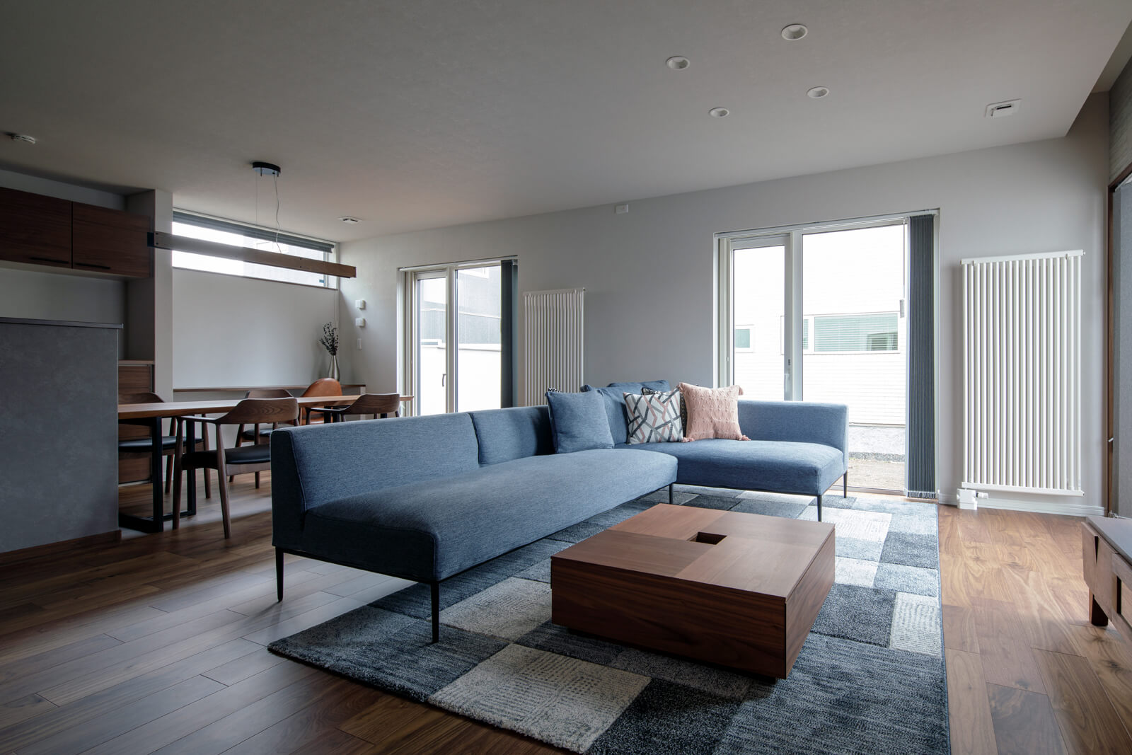 同モデルハウスでは、その高い住宅性能はもちろんのこと、豊かな住空間にもこだわりました。リビングに続くドアは天井まで届く高さのグランハイドアを採用。天井面がひとつながりになり、贅沢な空間の広がりをつくりだします。建具や床材はすべてウォールナットに色調を合わせ、シックな高級感を演出。窓には日射取得型のエコガラスを採用して、さらに太陽の恩恵を取り入れています。