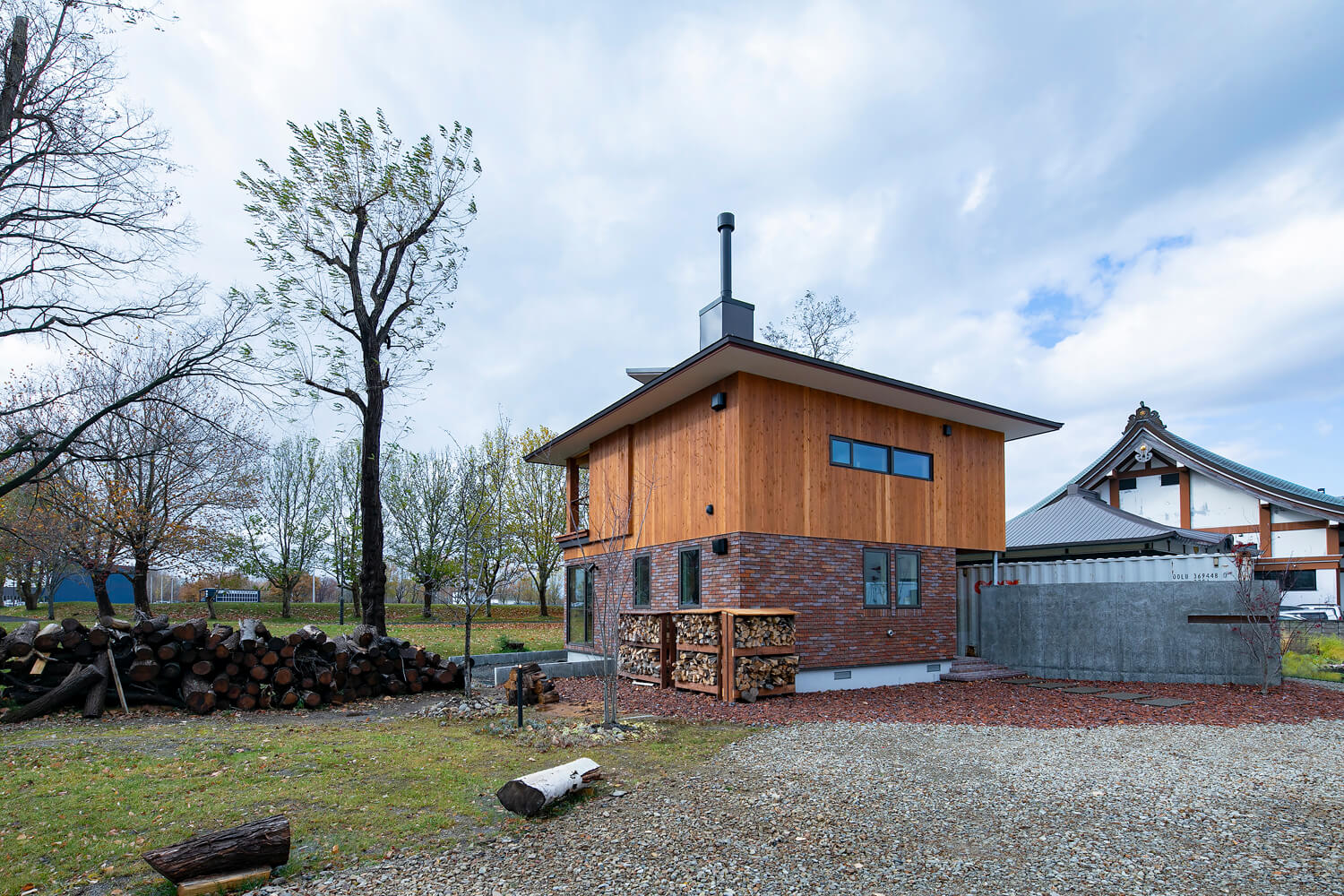 江別市の緑豊かな飛鳥公園の隣に建つ、江別レンガと道南スギの外壁が印象的なこの建物は、アトリエキバコの事務所を兼ねた「アトリエ」です。