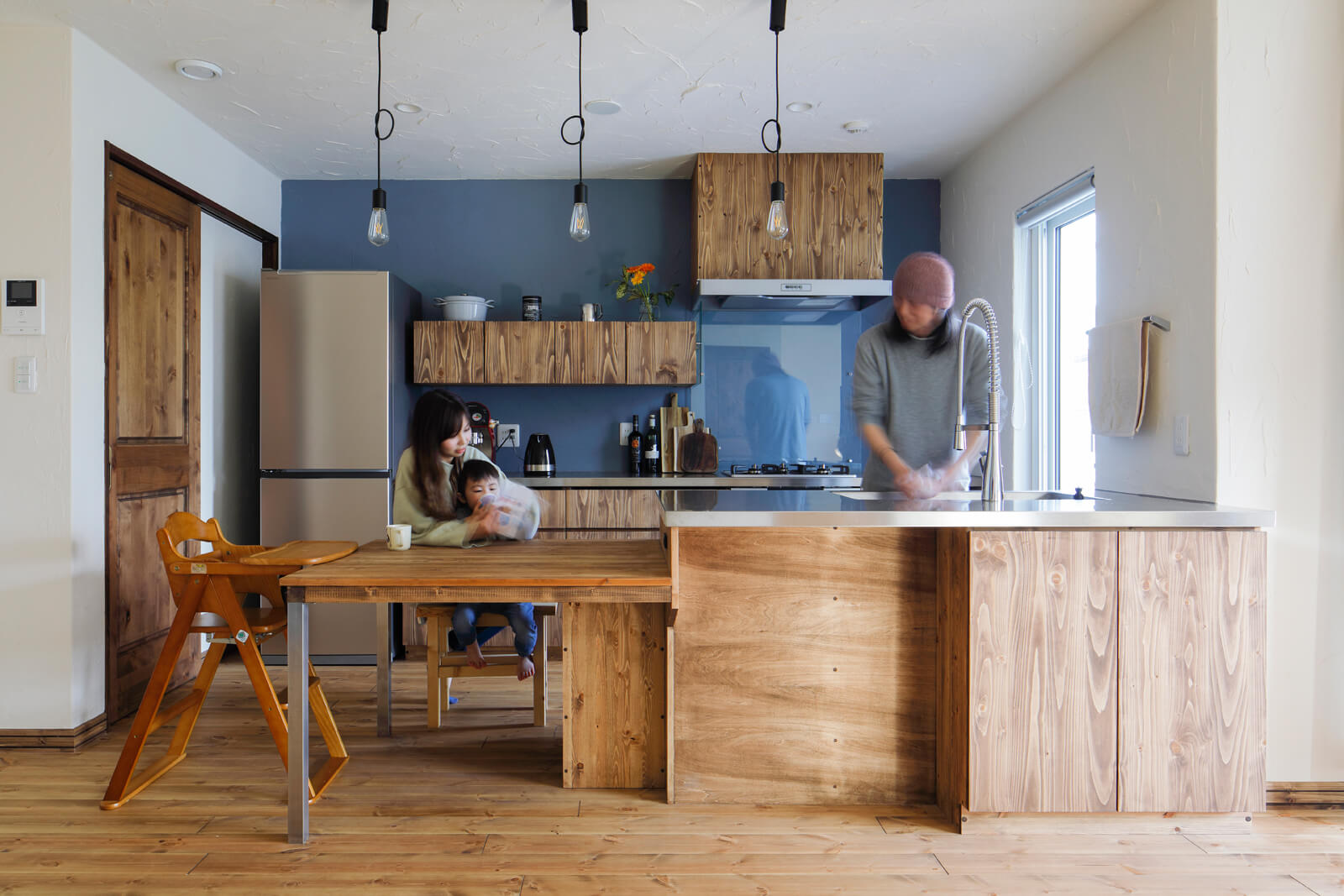 家づくりがはじまると、ご夫妻は現場に何度も足を運び、大工さんへ直にリクエスト。こだわり抜いたキッチンは数回のプラン変更の末、コンロとシンクを分けたペニンシュラ型に辿り着きました。スワン型の水栓やステンレスの天板はAさんが選び発注。コンロ前の壁面に強化ガラスを使うことも提案しました。木目がぴったりと合うキッチン収納の納め方は、多田工務店ならではの丁寧な仕事です。アクセントウォールは奥さんの要望で、現場で色を調節し、吊り戸棚の間接照明で色塗壁が映えるようにしました。共同作業でつくり上げたように感じ、完成のときには「もう大工さんと会えなくなる」と寂しくなるほどだったそうです。