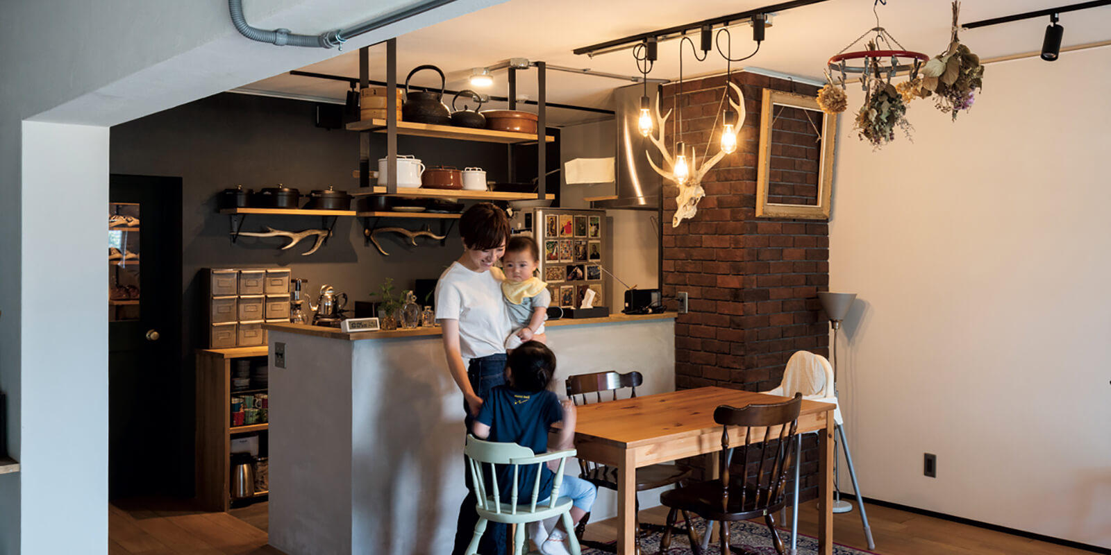 Kさんが購入したのは、江別市内のJR駅近くに建つ築29年のマンション。専用庭付きの1階にあり、占有面積は約93㎡。4LDKだった間取りを2LDKにリノベーションしました。「子どもが2人生まれ、住んでいた賃貸マンションが手狭になったんです。新居として、新築戸建ても考えましたが、コストや生活の利便性などから判断して、マンションリノベに決めました。古いもの集めも好きですが、古いものを直して使うことにも喜びを感じるんです」。