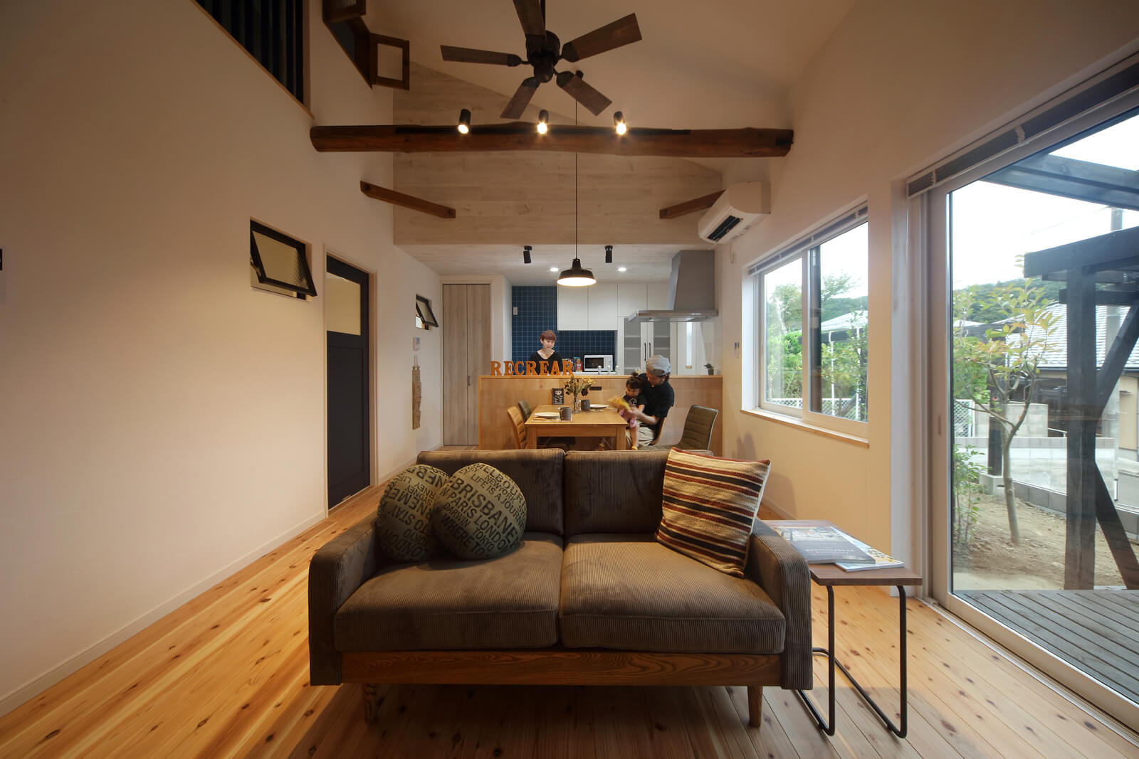 ナチュラルな中にも、アウトドア好きのご夫妻に合わせて甘くなりすぎないよう、ご夫妻が選んだタイル風の床材やアクセントクロス、アンティーク風チェッカーガラス、アイアンなどを上手に散りばめました。リビングを貫く現しの太鼓梁や、アウトドアリビングとして重宝しそうなウッドデッキは、もとの家のものをそのまま利用しています。
