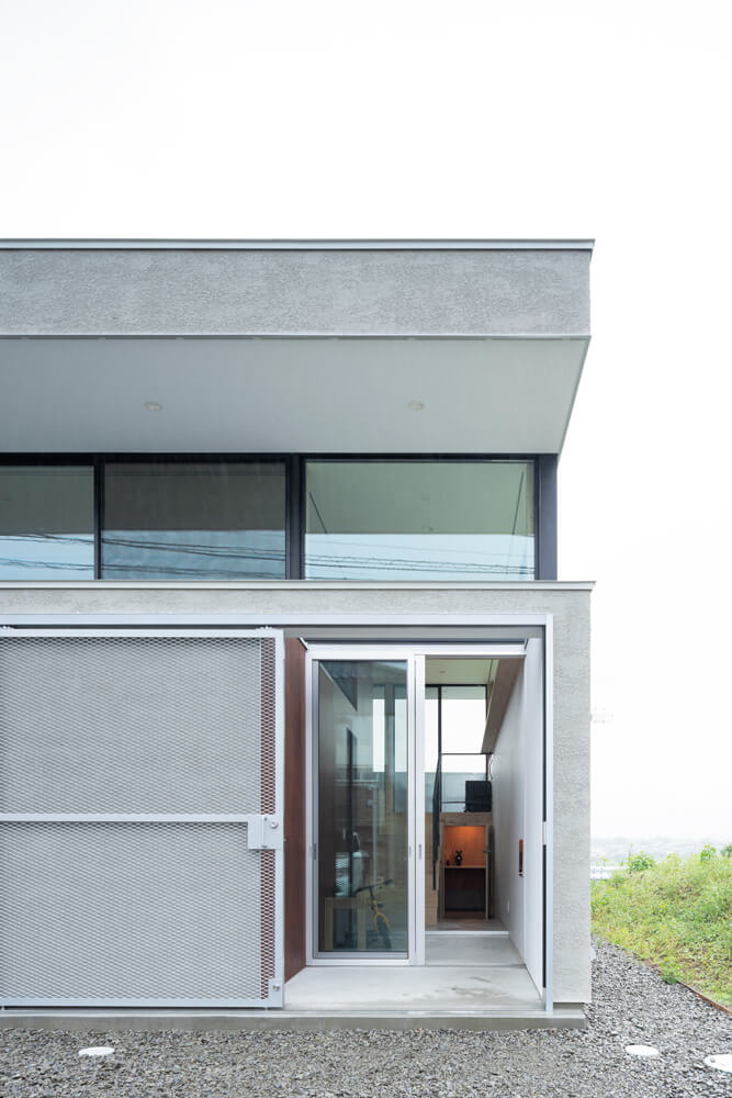 建築地の周りは畑や林など緑が多く、東側の崖越しに眺望が広がる高台の住宅地。そこでプライバシーを確保しつつ、家の外に広がる豊かな環境を楽しめるよう考えて設計されたのが、横長窓を四方にまわした四角いハコの上に、フタを載せたようなこのフォルムです。一見すると2階建てのようでも、これは平屋。4層のスキップフロアが空間をつないでいて、LDKからは安心感の中で開放的な景色と光を満喫できます。