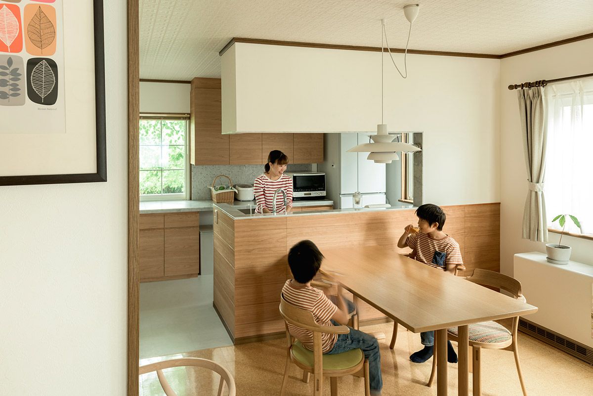 共働きのOさんご夫妻は利便性を重視して築17年の物件を購入。2階の増築やキッチン・水まわりの改修など、大規模なリノベーションに取りかかりました。増築した2階部分には二人のお子さんたちのために子ども部屋を確保。キッチン〜トイレ〜ユーティリティは改修によって生活動線ができ、家事の効率もアップしました。既存の木部と自然になじむサクラ材や大理石などを使用し、もとの素材を生かす造作に家族も大満足です。