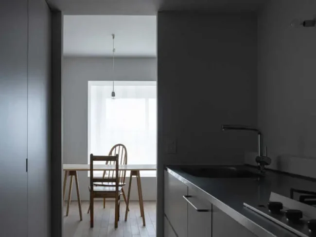 50平米を切るコンパクトなマンションで、サンルームと2つの小さな和室、ダイニング・キッチンからなる2DKというレイアウト。光の行く手を阻んでいた押し入れや、間仕切りをすべて取り払い、細切れになっていた室内をつなげて開放感のある空間を構築しました。