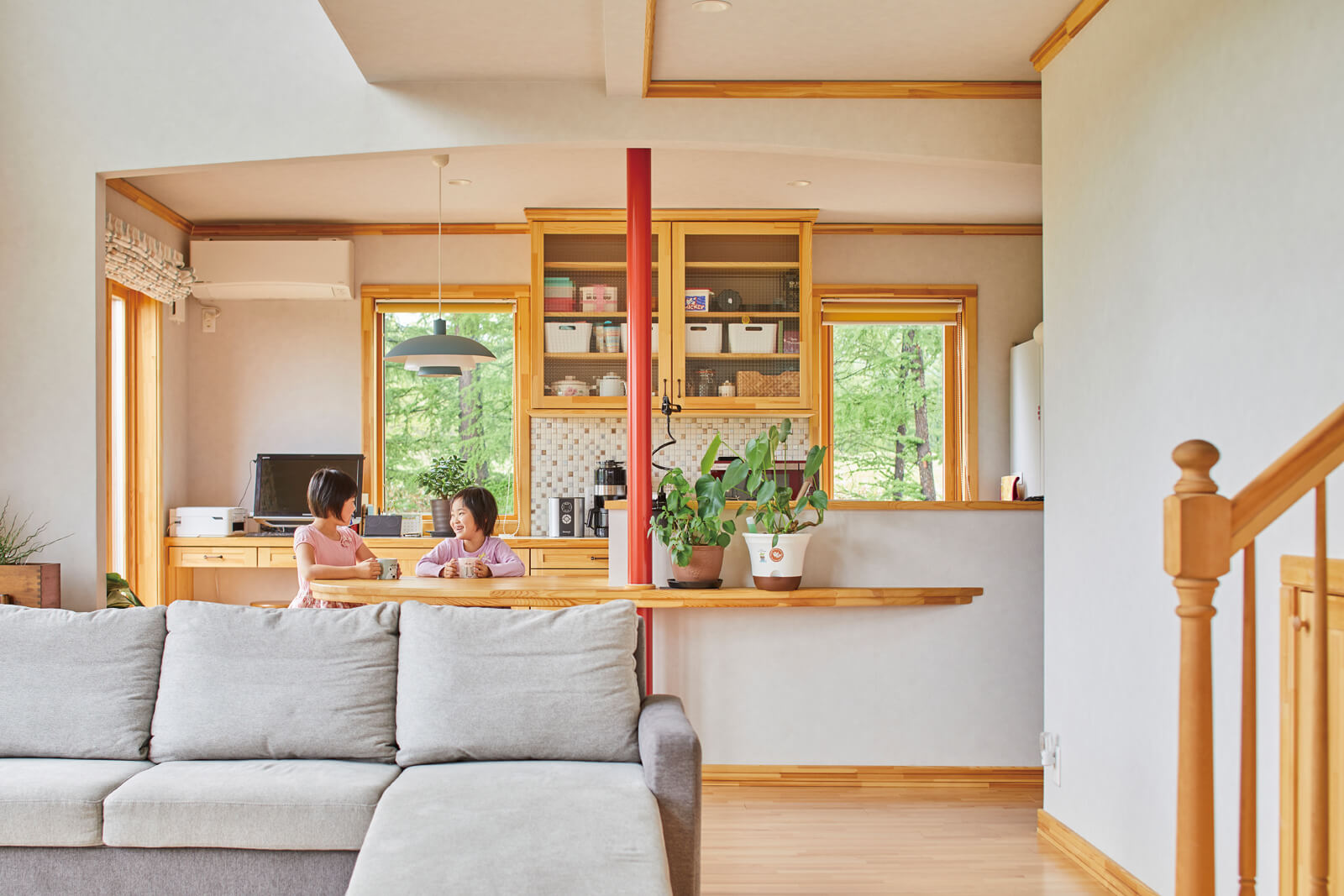 秋が深まるころ、Nさんが雑木林を切り拓き整備した230坪の土地に新居が完成。1階はLDKと水まわり、吹き抜けでつながる2階にはロフトを設けた子ども部屋とウォークインクローゼットを備えた寝室をレイアウト。リビングに設けた大きな開口からは隣接する牧草地の緑が一望できます。「大きな吹き抜けがあって、窓が多いのに、暖かくて結露もありません。冬も天気が良い日は窓からの陽射しだけで室内がちょうどいい温度になるんですよ」とNさん。