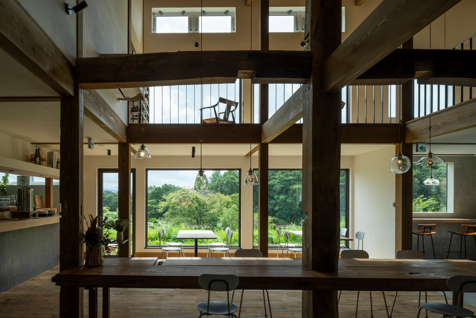 2021年8月、移住の決意から3年の時を経て、オーナーの夢が結実。カバの柱、センの梁、カツラのテーブルなど古材の力強さと温もりを生かした空間は、大きな吹き抜けと開口が設けられ、開放感たっぷりです。窓越しに広がる借景は光の移ろいで刻々と表情を変え、見飽きることがありません。夜の帳が下りれば、個性豊かなガラスのシェードの灯りが店内をやわらかく照らし、古材や塗り壁の陰影を引き立てます。「お客様にも、自分の家のように落ち着くと好評です。まだ外周りが未整備なので、これからも武部建設といろいろと相談しながら、外構や庭の整備をしていきたいと思っています」と、オーナーは笑顔で話してくれました。