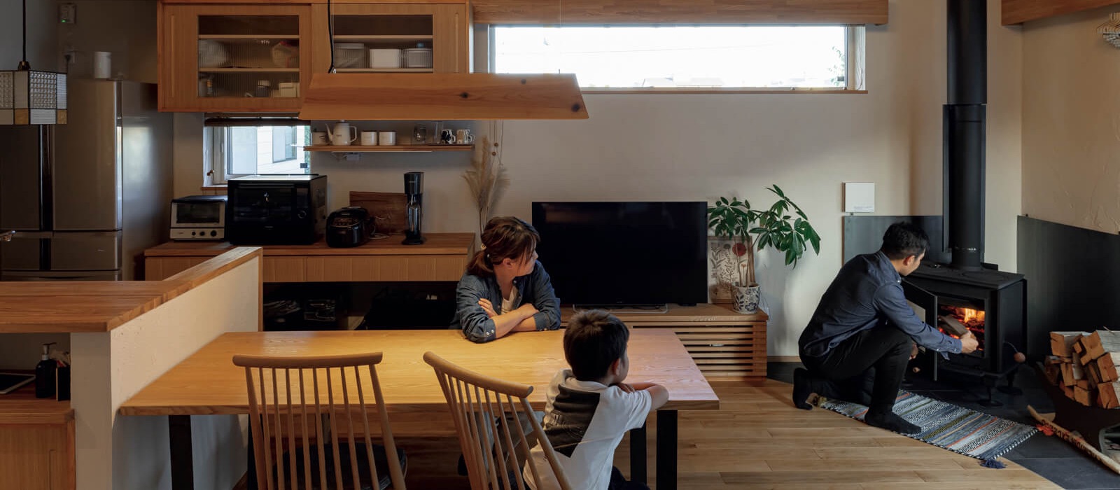 2年前、ご両親が減築リノベーションで実現した新居は「いずれはマイホームを」と考えていたAさんご夫妻の理想そのままでした。「帰るのが楽しみになるような、ホッとくつろげる家がいいと思っていました。生まれ変わった実家は、まさにそれをカタチにしたようでした」。そう振り返るAさんは、薪を焚べ、炎を眺めてリラックスしているお父さんの姿を見て、新居に薪ストーブを採用したいと強く思ったといいます。
