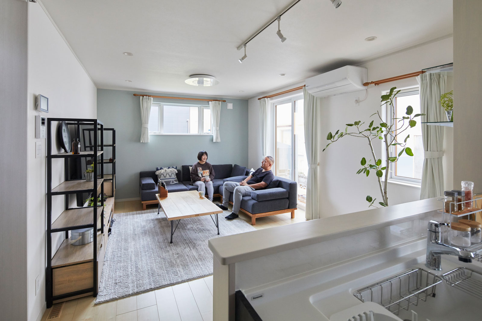 白を基調にナチュラルな雰囲気でコーディネートされたLDK。シックなグレーの機能的なキッチンと、木の質感が優しいリラックスできるリビングは、Oさんご夫妻のお気に入りです。ダイニングテーブルは置かず、ローテーブルで空間の広がりを演出しました。