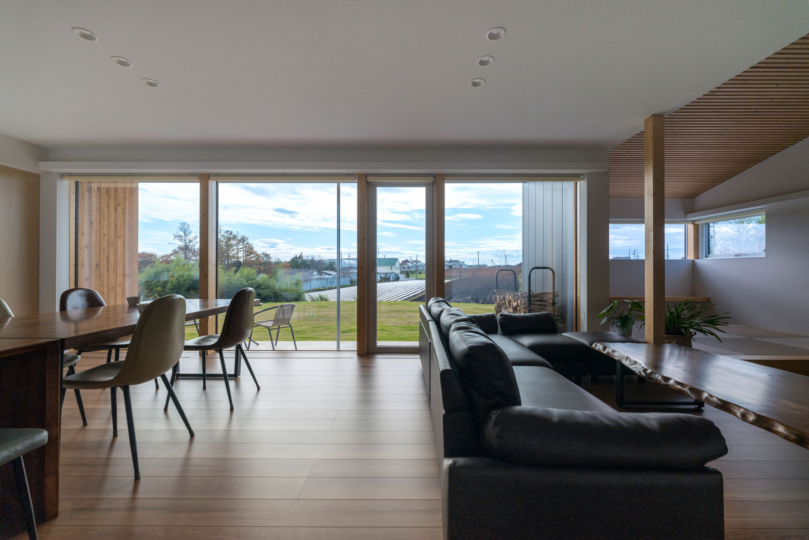 その要望どおり、玄関ホールや小上がりの畳スペースがシームレスにつながる1階LDKは、約34帖ものゆったりとした大空間。リビングの南面には特注ガラスによる大開口が設けられており、窓の外には庭の芝生、その先には壮大な畑が広がります。「この魅力的なランドスケープを活かす設計を心がけました」とワック アーキテクツの和田 隆さん。奥さんも「窓からの四季折々の眺めに心が癒やされています」と微笑みます。