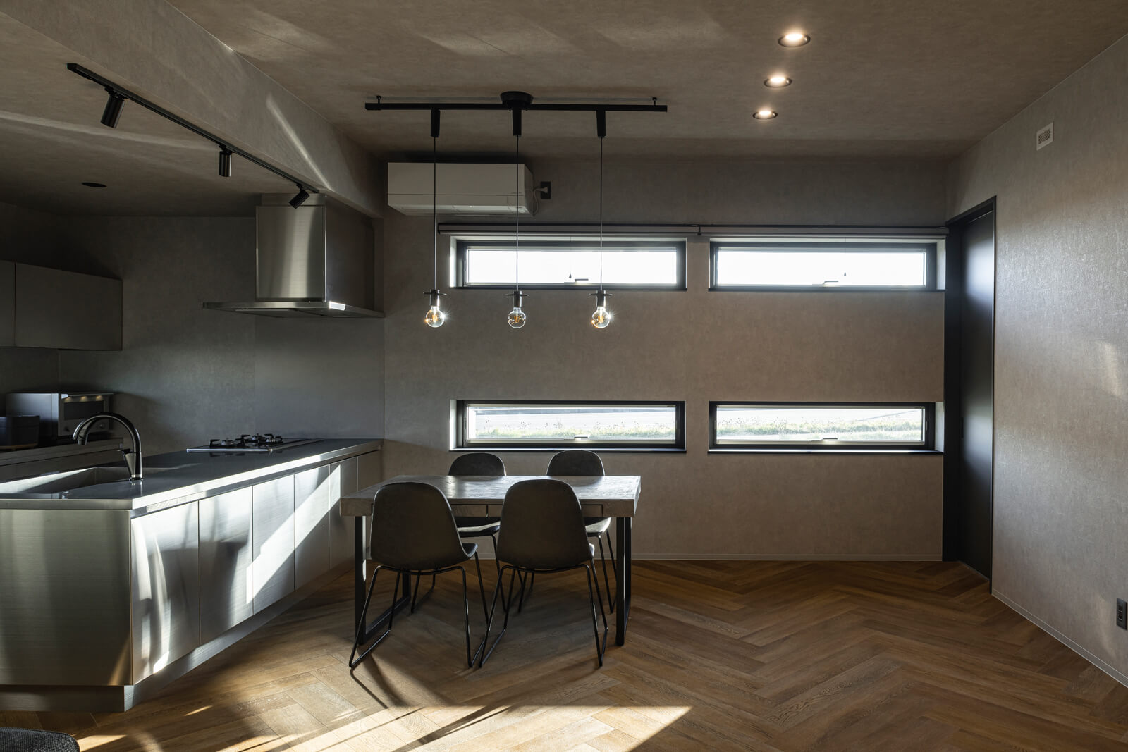 2021年7月にYさん宅は完成。待望の新居は、歳を重ねても過ごしやすい平屋です。床はヘリンボーン張りで、ブラックとグレーを基調に、スタイリッシュに仕上げた空間はご夫婦が希望したとおりのアーバンな雰囲気。リビングの建具にはガラス扉を採用し、玄関ホールやその先のユーティリティにまで視線が抜ける見通しの良さが、LDKにさらなる広がりを与えてくれています。性能面は小山内建設の標準である高い断熱・気密を備えた超省エネの「Q1.0住宅」。長持ちで暖かく、暖房費もかからない住まいを目指す、同社の技術が結集した高性能住宅です。