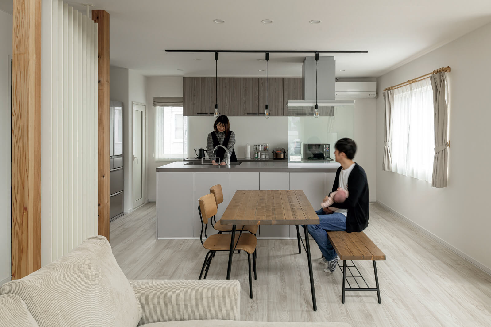 そう話すMさんは早速、奥さんの実家近くにある住宅街で土地探しを開始。「札幌支店の方にも手伝ってもらい、希望どおりの宅地が購入できました。心強かったです」。そして、2020年暮れからひと冬かけて、設計担当者とじっくり話し合い、吹き抜けを設けた開放的なリビング・ダイニング、その景色が見渡せる場所に配置したアイランド型キッチンが主役のプランを完成させました。「ちょうどそのタイミングで子どもを授かり、女性の設計士さんが親身になって育児がしやすいようきめ細かな提案をしてくれました」と、奥さんは嬉しそうに話します。
