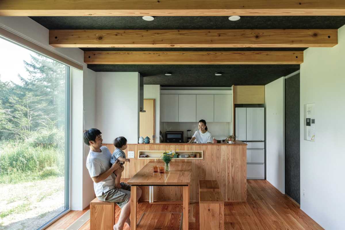「日高の山並みや田園風景にマッチする外観と、木の温かさを感じて暮らせる家を建て、これからの人生は二人で楽しくゆったりと過ごしたい」という希望を叶えた木の家です。くつろぎの場となるリビングは、陽射しをたっぷり取り込む大開口と吹き抜けが設けられ、明るくのびやかな空間。職人の息づかいが感じられるような丁寧な手づくりでつくられた品格と味わいのある住まいです。