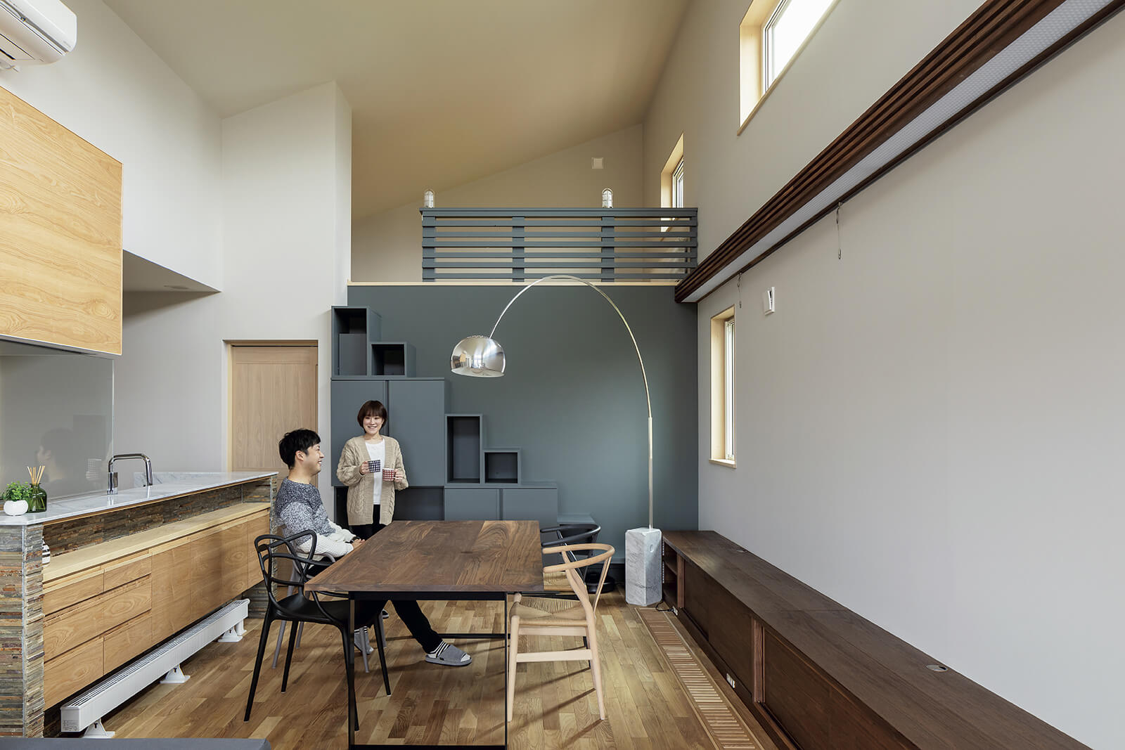 「素材感を生かした造作キッチンもカッコいいだけじゃなくて、収納計画が完璧で片付けやすいのに驚きました。広々とした空間を見ながら家事ができるのも、気持ちがいいものですね」と、奥さんも笑顔で言葉を継ぎます。眺めの良いリビング・ダイニングには、天井高を生かしたロフトも設えられ、友人を招いたときには客間として活用することができます。美しく機能的なくつろぎ空間は、ご夫妻自慢のもてなしの場となることでしょう。