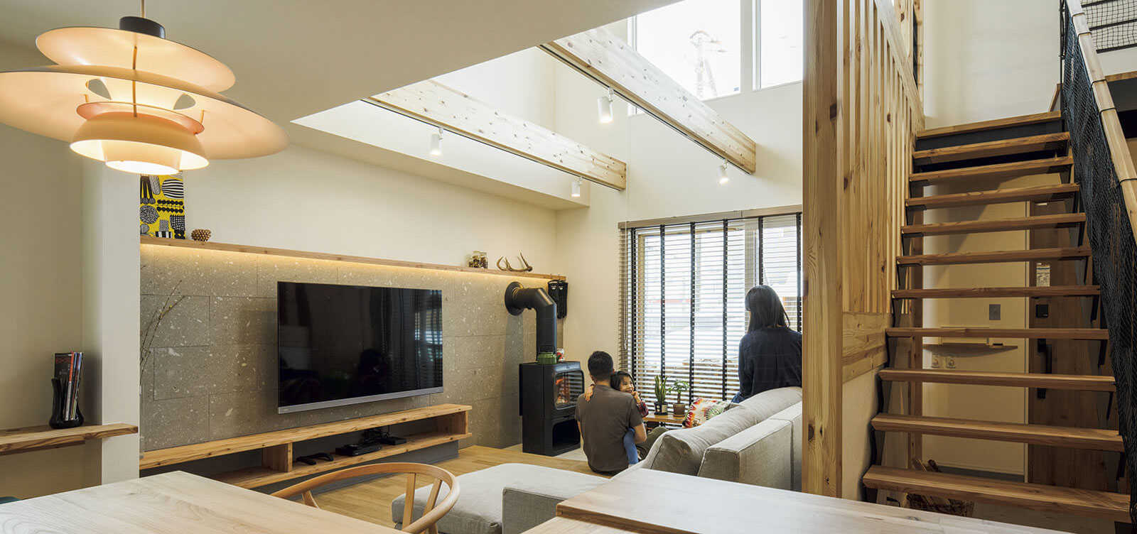 それまでのマンションでの暮らしでは叶わなかった「一軒家ならではのことを実現させたい」という思いがお二人にはあり、開放感や自然な素材が感じられる住まいが理想でした。新居は、薪ストーブのある土間エリアと大きな窓、開放感のある吹き抜けリビング、スケルトン仕様の階段など、お二人の希望がベストな形で具現化されています。