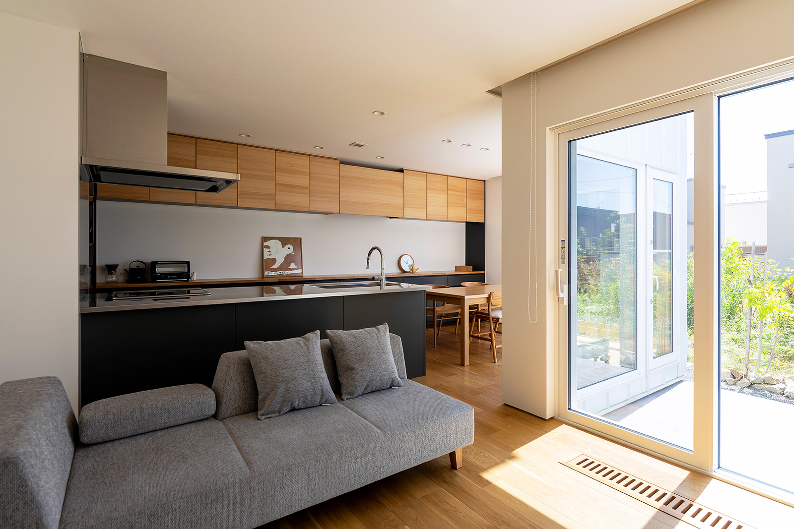スタイリッシュなキッチンは、壁面の5mにも及ぶ長い吊り戸棚が圧巻です。木の扉にすることで圧迫感もなく、空間のアクセントになっています。「自然に包まれた環境ではありませんが、窓の外には緑があり、家の中も木の風合いを感じられます。在宅時間が増えたからこそ、家が楽しく快適なことに今まで以上にありがたみを感じます」と、Nさんは語ってくれました。