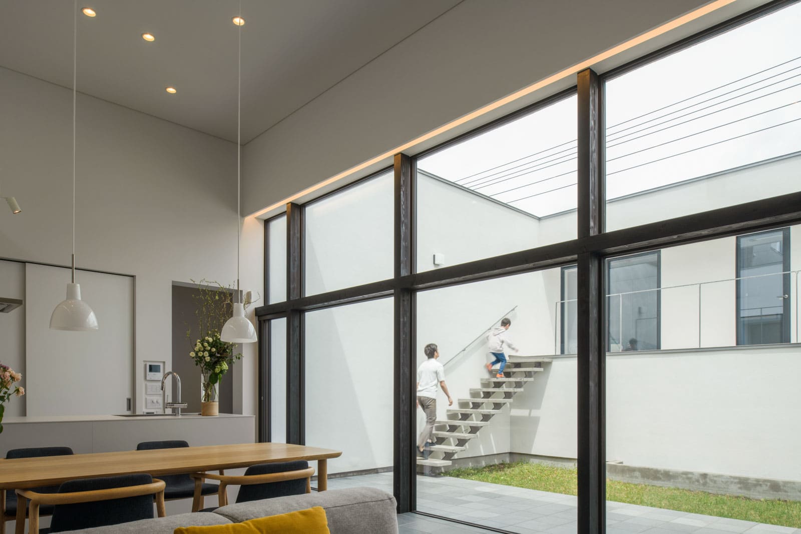 内側に大開口を多用したLDK、中2階のプライベートフロアの中心にある中庭は、子どもの絶好の遊び場。暖かな時期は、家族の第2のダイニングとしても大活躍します。また階段が設けられているので、中庭通じてフロアとフロアの移動もできます。
