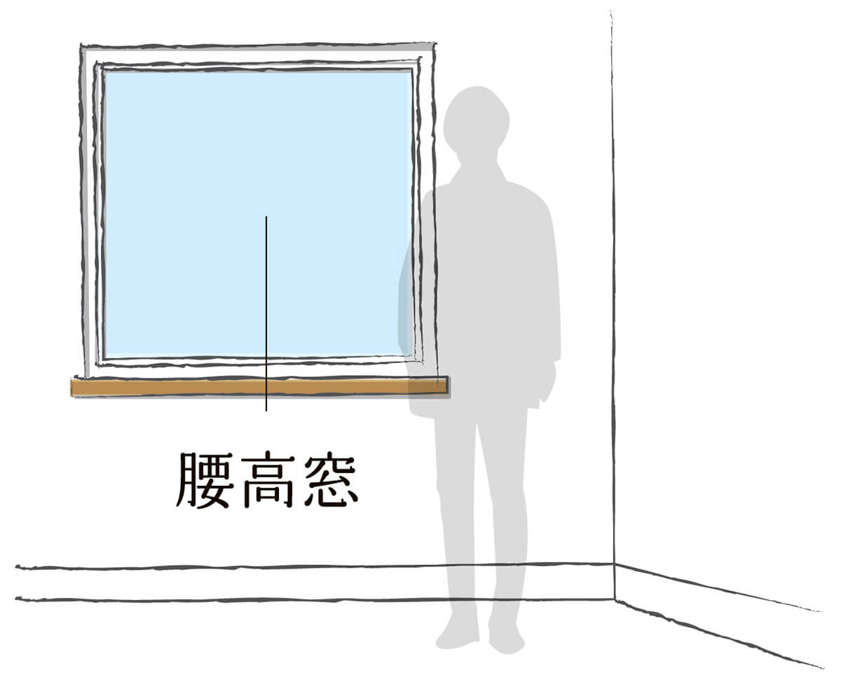 腰の高さに設置される窓のことで、一般的には床から90㎝程の位置に設けられる。椅子に座った状態で外が見渡せる。出入りすることはできないが、窓の下の壁面に棚や物を置いてスペースを有効活用できる