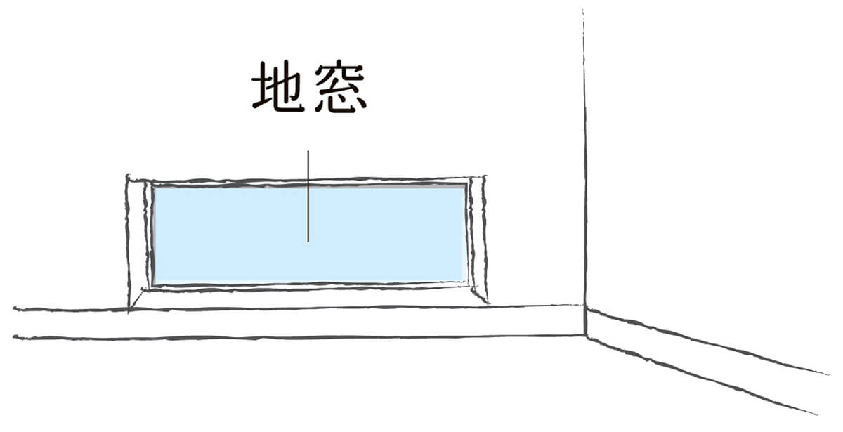 床面に近い位置に配置した窓。外からの視線を避けながら、床に座った状態で庭や景色を眺めるのに適している。対局に位置する窓と組み合わせて開閉することで、夏場は冷たい空気を室内に行き渡らせることもできる