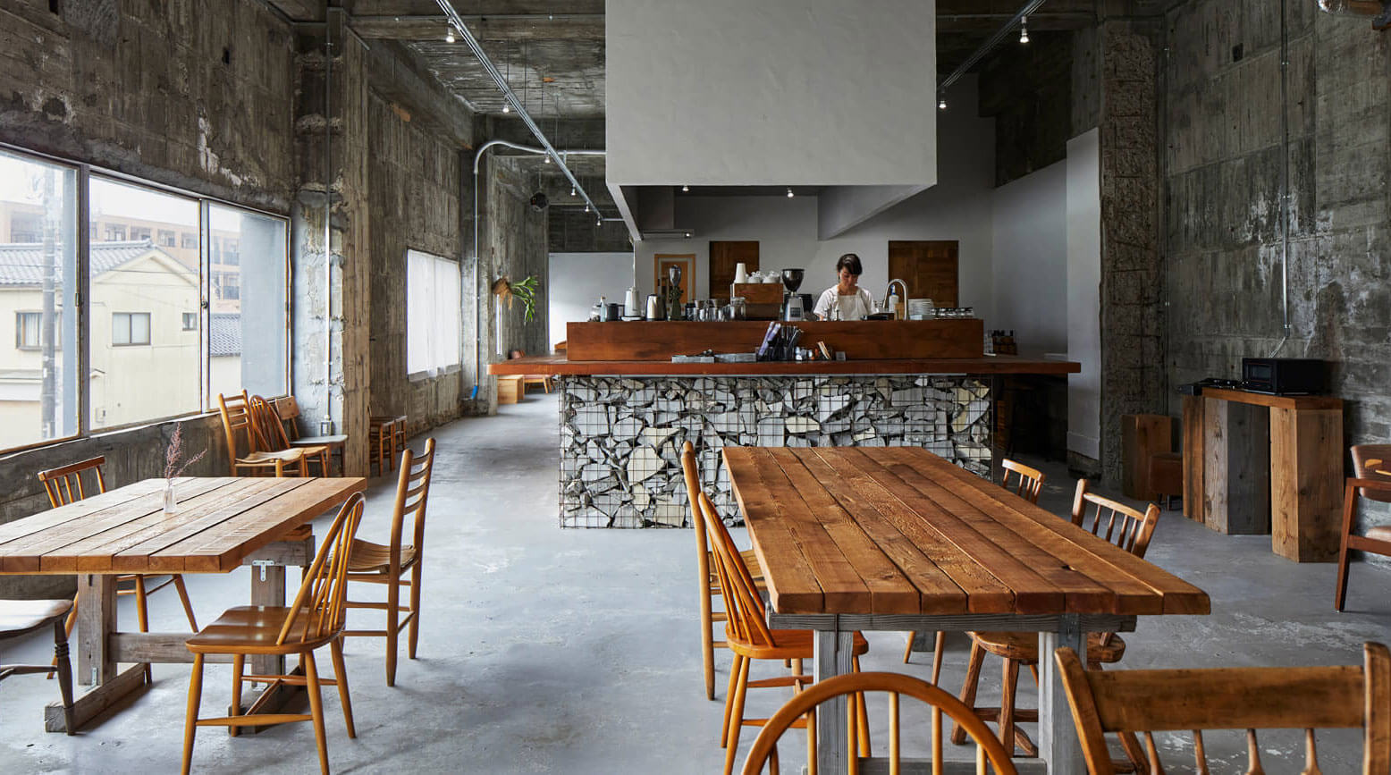 国際貿易港として栄え、観光エリアとしても賑わう福島県いわき市の小名浜港。そこから内陸に向かって徒歩10分ほどのところに、鉄筋コンクリート造の3階建てが立っています。この1・2階にあるのが、同市出身の戸田宗輝さんがオーナーの店「ALAYA」です。カフェがあるのは2階。階段を上り、フランスのアンティークドアを開けると、そこには意外なほど天井が高く、表情豊かなコンクリートが目を引くラフな趣の大空間が広がります。