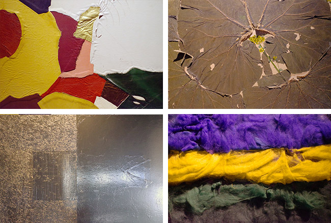 会場は敷地の奥の方の倉庫だったんだけど、作品と光で演出した、ステキないんすたれーしょん。アルミホイルや靴下や、葉っぱや新聞紙…身の回りにあるいろんなモノを素材に見立てて、実験的に合板に化粧貼りしてみたんだって。発想が楽しいよね。