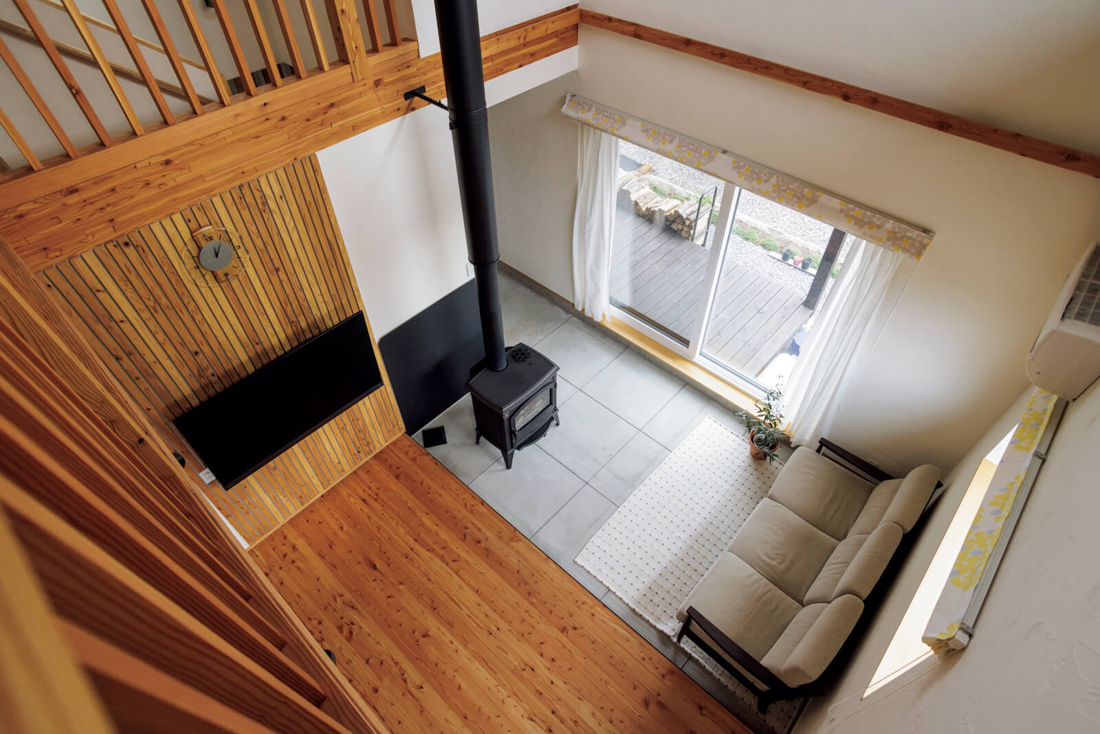 薪ストーブのある土間はリビングも兼ね、吹き抜けの採光窓やウッドデッキとつながる大開口から陽射しがたっぷりと入ります。「寒い季節は太陽の光と薪火の熱でコンクリートタイルの床が暖まり、サンルームのようです。あまりに心地よくて、家にいるときはほとんどリビングで過ごしています」と奥さん。