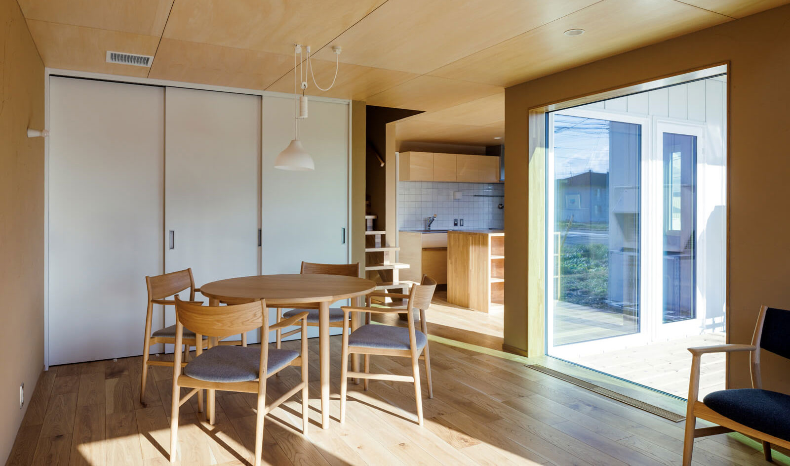 例えば、天井高の低いダイニング・キッチンとリビングの吹き抜けとの視覚的なコントラストや、大きなコーナー窓とウッドデッキを介して外とのつながりを感じられるつくりは、空間に広がりが感じられる設計的な工夫のひとつ。射し込む光が室内に美しい陰影を描き、色味と風合いが心地よい塗り壁や木の素材感と相まって、一層の上質さと心地よさをもたらします。