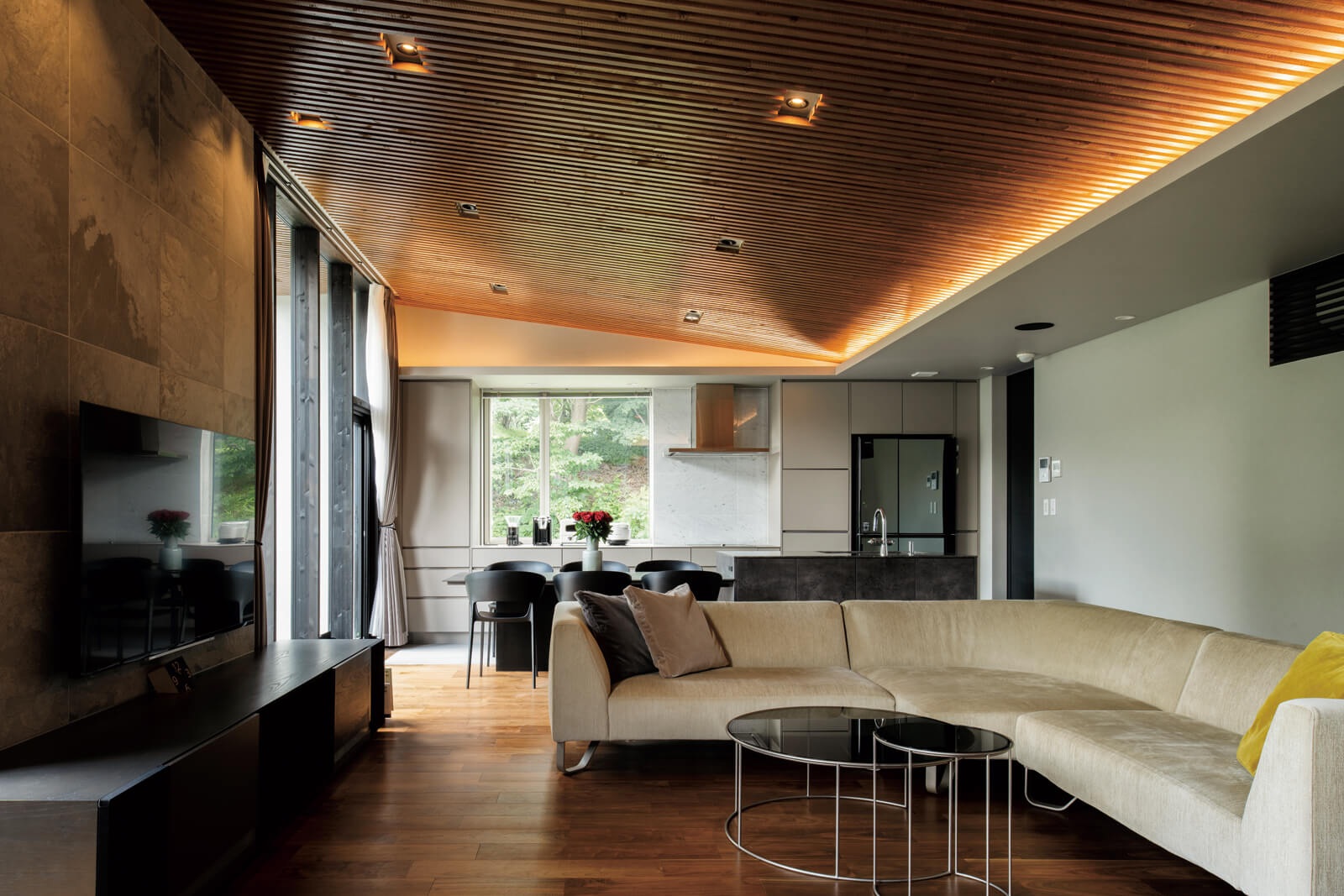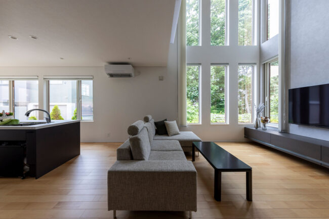 2019年1月、敷地に寄り添うように建てられた住まいは4層のフロア構成。LDKを設けた2階には、雑木林を望むカーテンウォールが設けられました。「窓が大きいのに、冬も暖かくて快適。ロードヒーティングも稼働していますが、ランニングコストは想定より少なく、デサインと性能がしっかり両立していることが実感できました」と、奥さんは話します。