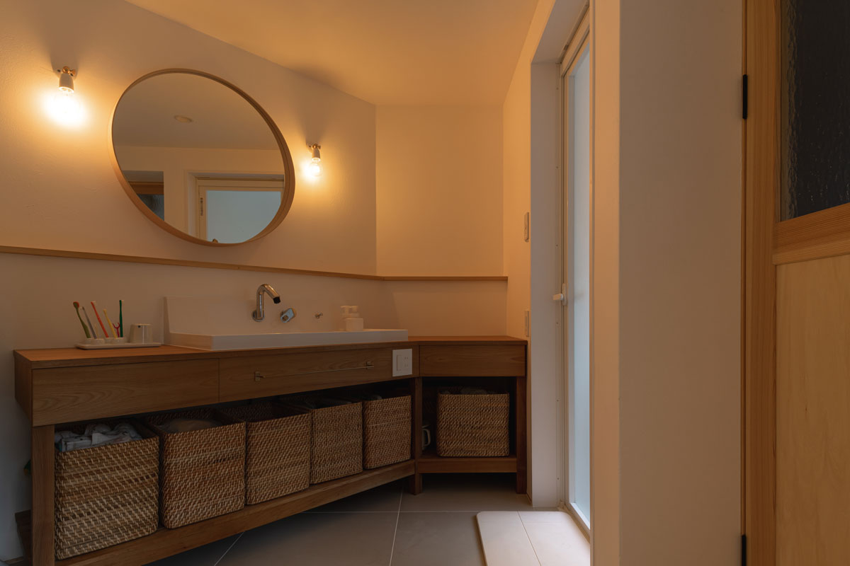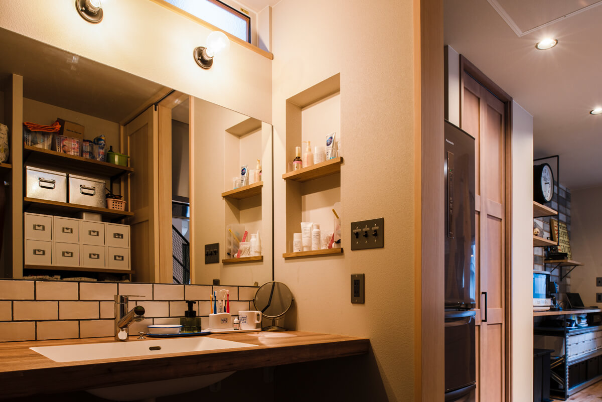例えば「ミラーキャビネット(正面のミラーの中にセットされた奥行が浅い収納棚)」は家づくりの定番。扉を兼ねたミラーの効果で生活感あふれる細々としたものを隠せるうえ、スペースの有効利用にもなります。