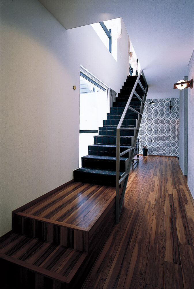 階段のかたちは中2階を経由する「かね折れ階段」、つくりは蹴込みのない「透かし階段」という合わせ技の階段。かね折れ階段にすることで、家周辺の緑をさまざまな角度から楽しめます。また透かし階段にすることで視線の抜けを持たせて、空間の軽やかさを演出。外と内のどちらに対しても、視線の変化が楽しい階段です。