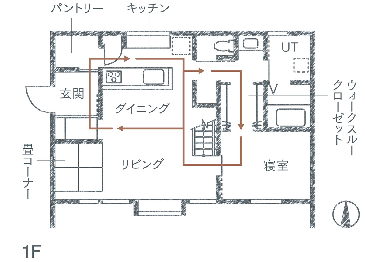 主な動線としては、玄関→シューズクローゼット→洗面→リビングというように、家族が混み合いがちな外出時や帰宅時の行動が滞らないようにする回遊動線、リビング→キッチン→ユーティリティー→ウォークスルークローゼットといった家事がストレスなく行えるように配慮された回遊動線などがあります。