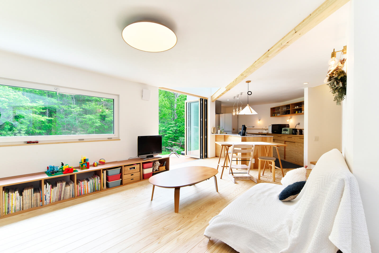 リビングの大きな窓はフルオープンにできる高性能な木製サッシで、そこからウッドデッキに出ると、贅沢な眺望を独り占めできます。約2坪のウッドデッキは、リビング部分を少し凹ませることで生まれた壁が両隣からの視線を遮る安心のプライベート空間。ランチやヨガなど娘さんとこの場所を日常的に使っている奥さんは、「娘に四季の変化を感じさせてあげられるのが嬉しい」と目を細めます。