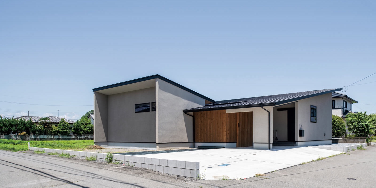 住宅街が続くエリアながらも、周囲に豊かな自然が広がる好立地に立つ互い違い屋根が印象的な住まい。この家は、2023年3月に完成したDさんご家族の新たな居場所です。「住宅雑誌で見かけた家のテイストが好みだったのと、自社大工がいるという安心感が決め手になりました」と、Dさんご夫妻は依頼先の関工務所との出会いを振り返ります。