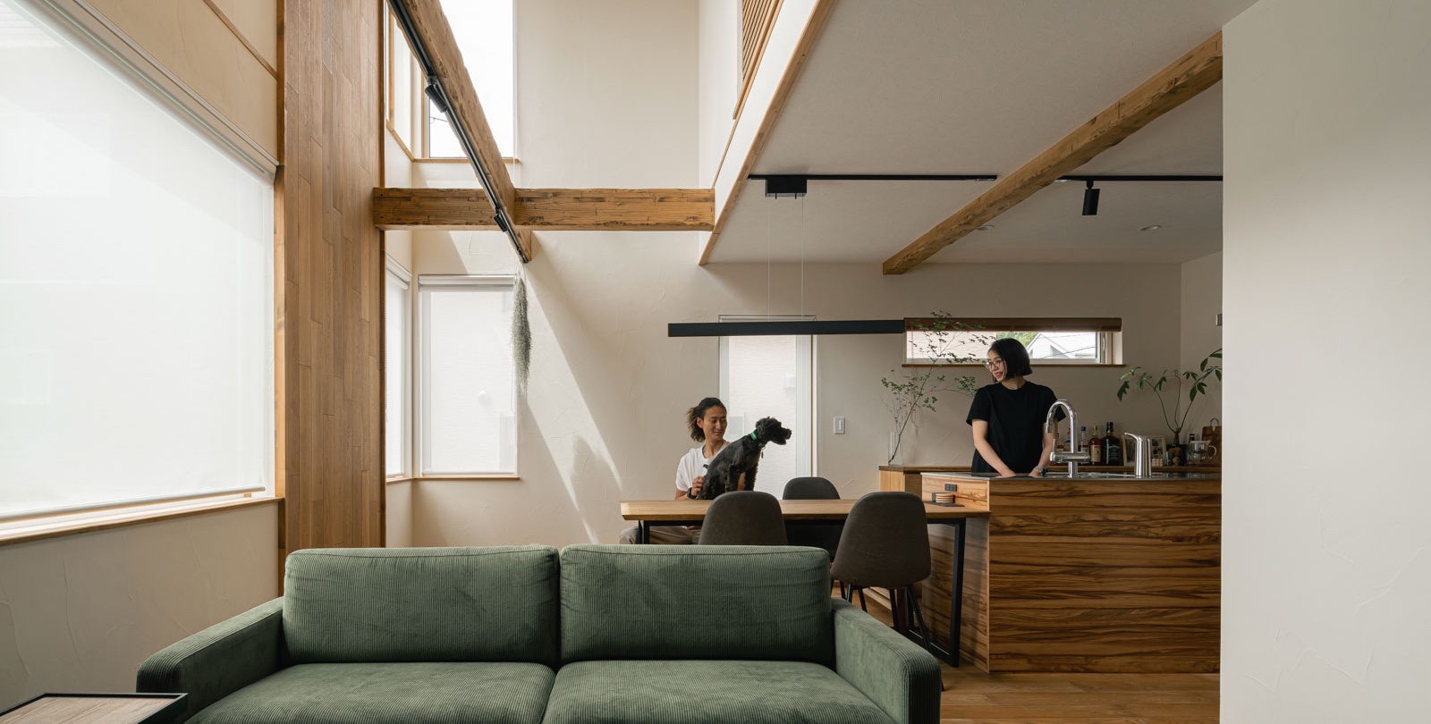 一軒家で生まれ育ったTさんご夫妻。結婚後のアパート暮らしはあくまで仮住まいという認識で、新築を念頭に情報収集を重ねていました。参考にと訪れた住宅展示場で話を聞き、感じたのは「営業担当者に商品を売る感覚で住宅の話をされると、自分たちの思い描く家が実現できないような気がしてしまいました」ということ。体温のある家づくりがしたいと考えるご夫妻にぴったりだったのが、「どんな家にする?」をキャッチフレーズに大工職人の手仕事が生きる家づくりを提案している北広島の高杉工務店です。