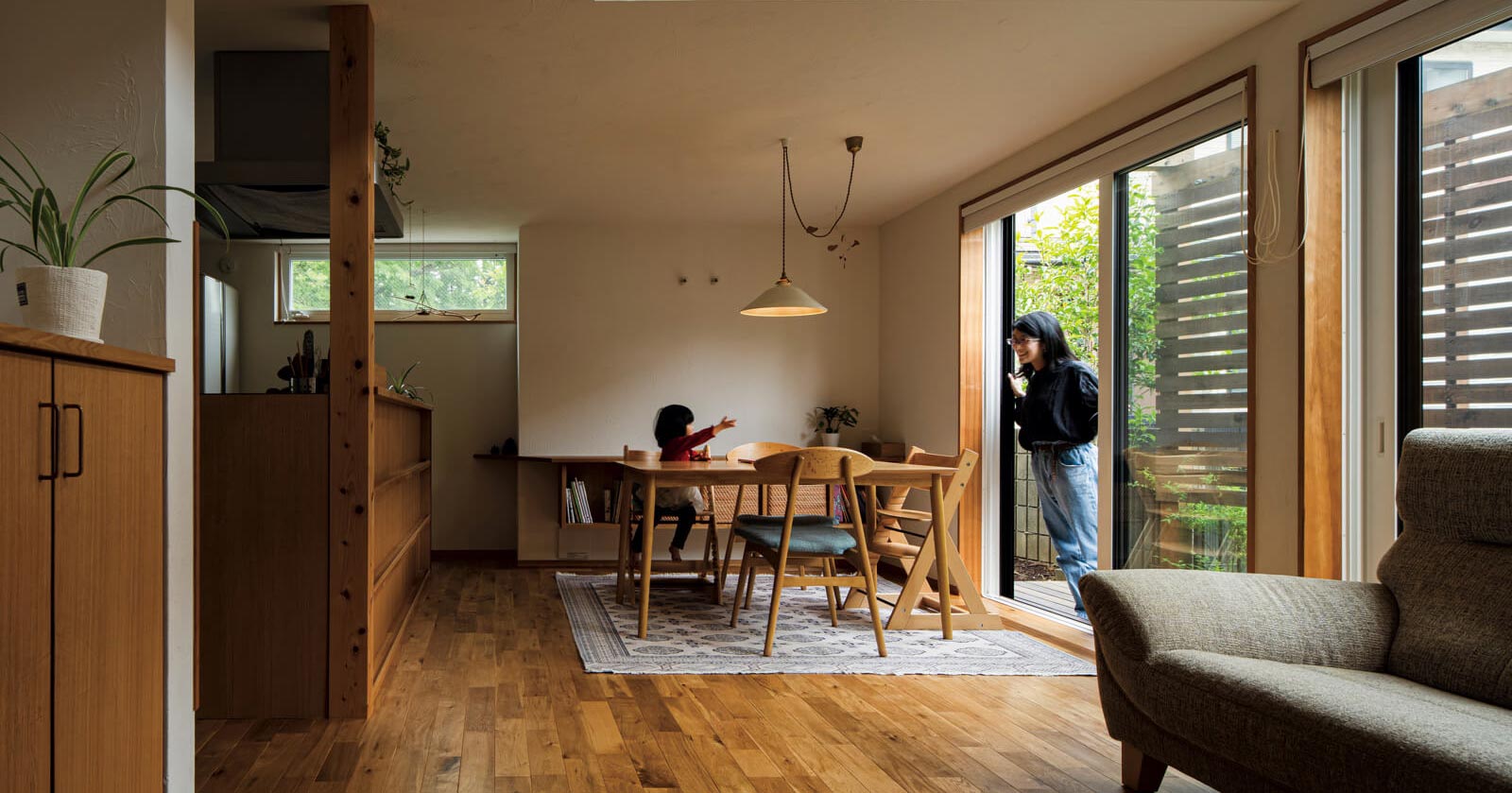 室内は、LDKの大きな窓からの陽射しで明るく照らされます。光の移ろいに時間や季節を感じられることも、居心地の良さにつながります。竣工から1年以上が経ち、庭木も育ってこの場所に似合う家になってきました。ご家族が愛着を持って住まわれている様子がとても嬉しいです。