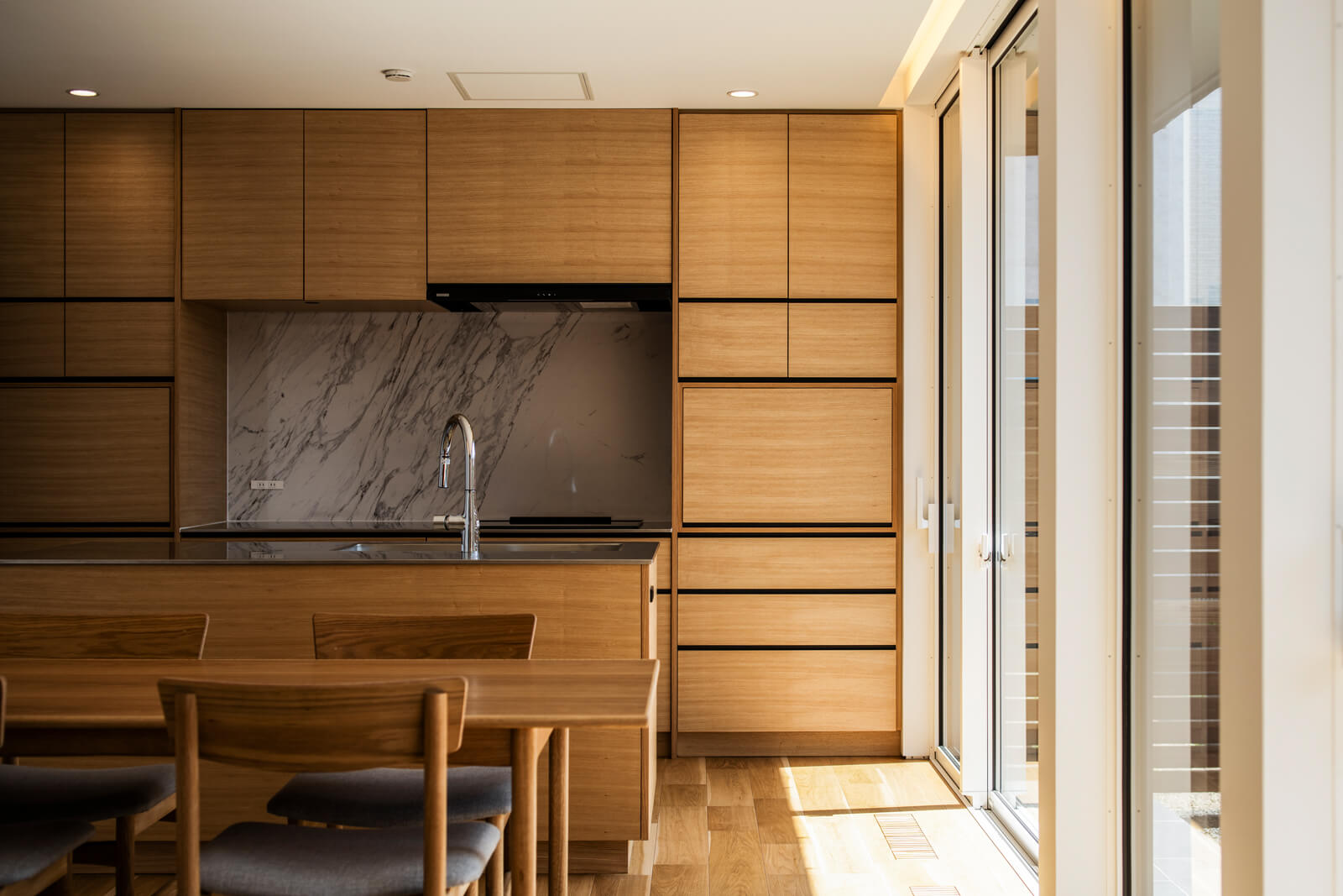 1階は、2階とは対照的に開放感あふれるパブリックスペースです。LDKの幅いっぱいに設けた大きな窓は、玄関土間と同じ黒の石タイルのテラスを経て外につながっています。庭はルーバーで囲ってインナーコート風に。夜は庭木がライトアップされ、リビングからの景色が一変します。造作キッチンにはナラ材をふんだんに使い、全体を木の雰囲気に。壁一面の背面収納は収納力抜群で、要望に応じて一部オープン棚にすることも可能です。