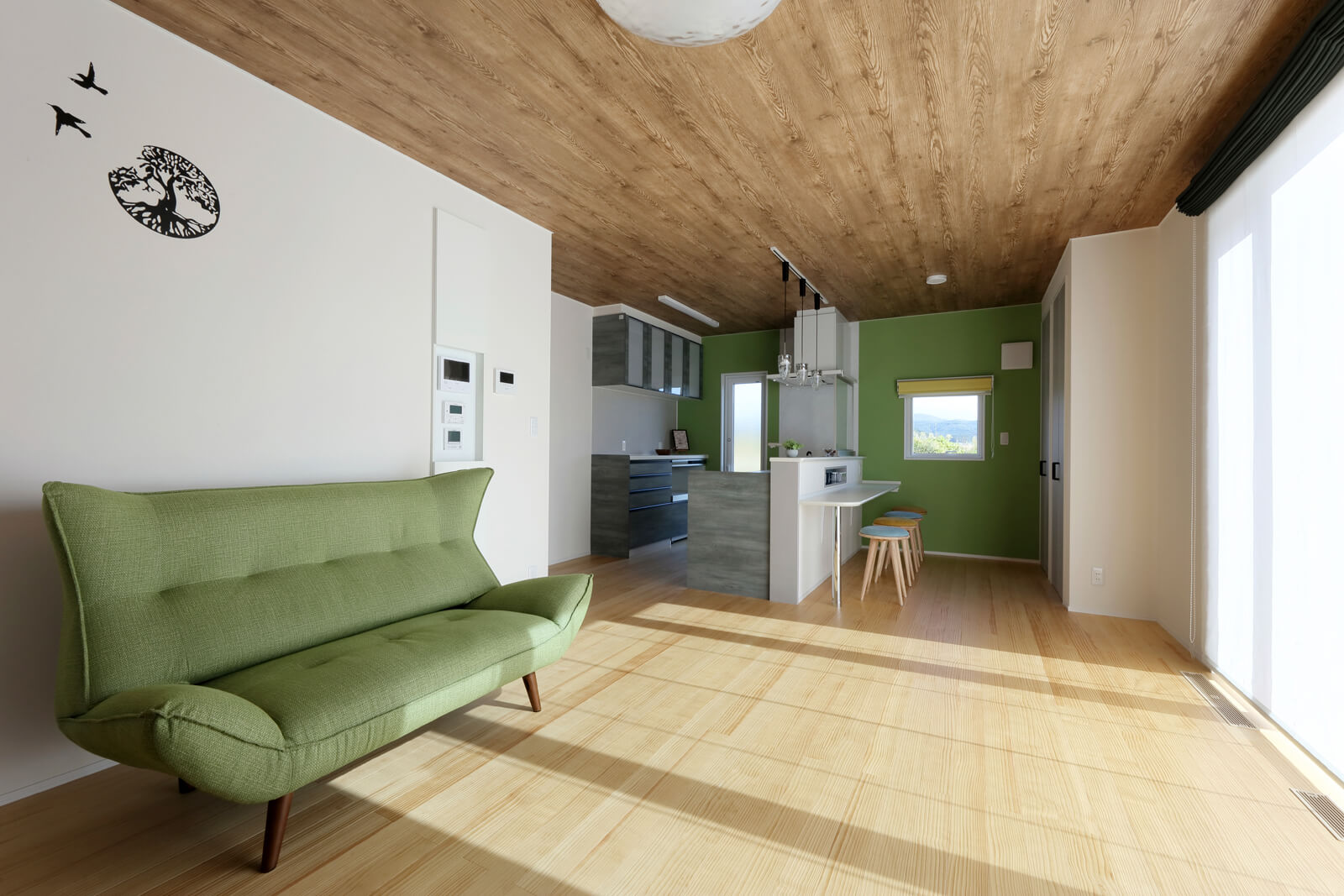 視覚的な広さを演出するための仕掛けも随所に。木の色と白を基調とした、気持ちまで晴れやかになるような明るい内装もその一つです。また、南面に配したLDKは、窓から注ぐ陽光により明るさと開放感を確保。隣接する客間の扉を開ければ、さらに開放感が高まります。そのほか、斜めにカットされた寝室やLDKへの扉、ロフトを設けた子ども部屋なども相まって、実際の面積以上の広さを感じさせる住まいに仕上がっています。