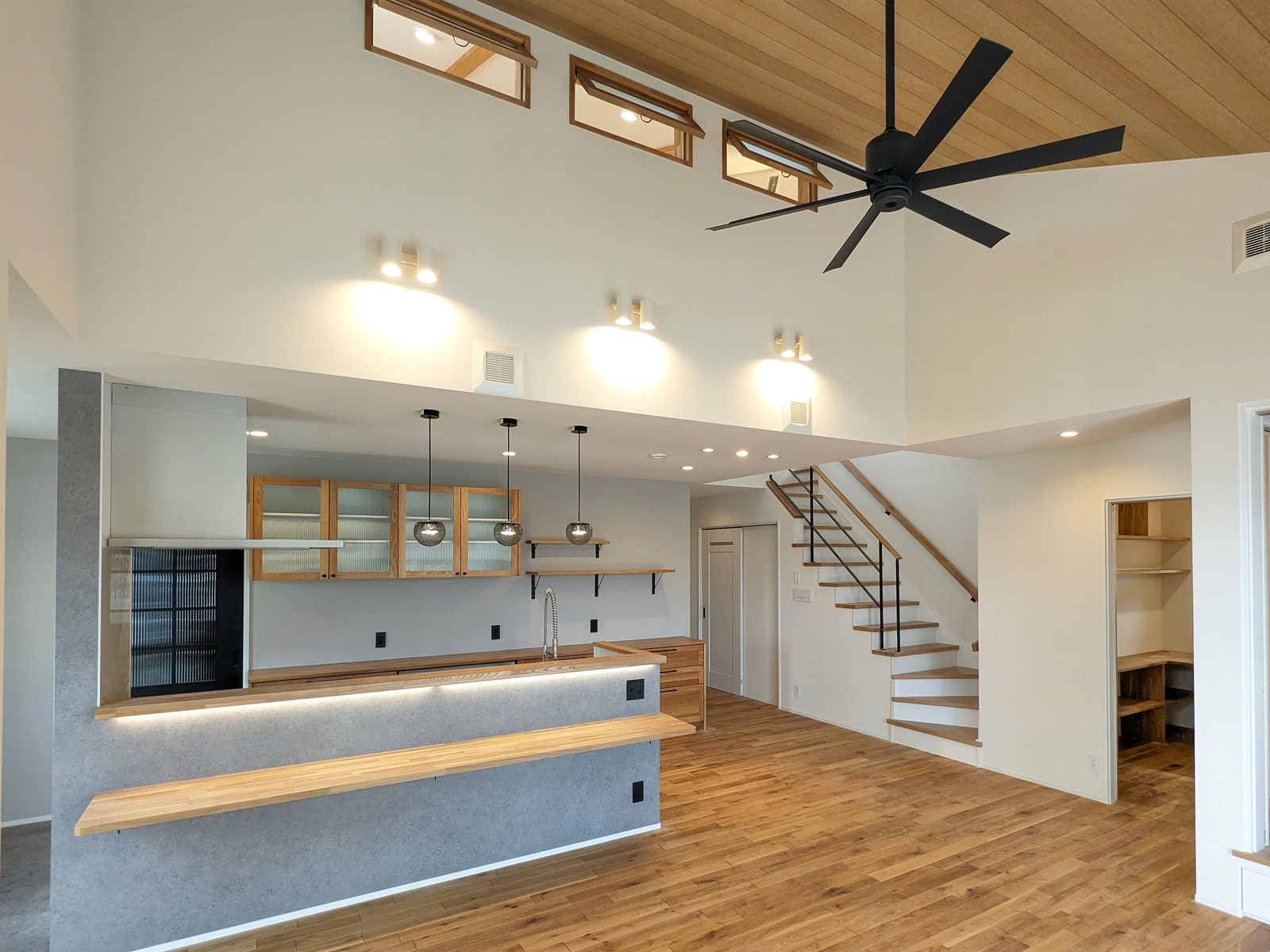 22.5帖のLDKは吹き抜けや勾配屋根の垂直方向の広がりが奏功し、数値以上の開放的な空間に。漆喰と木目の中で、キッチンの硬質感が絶妙なバランス