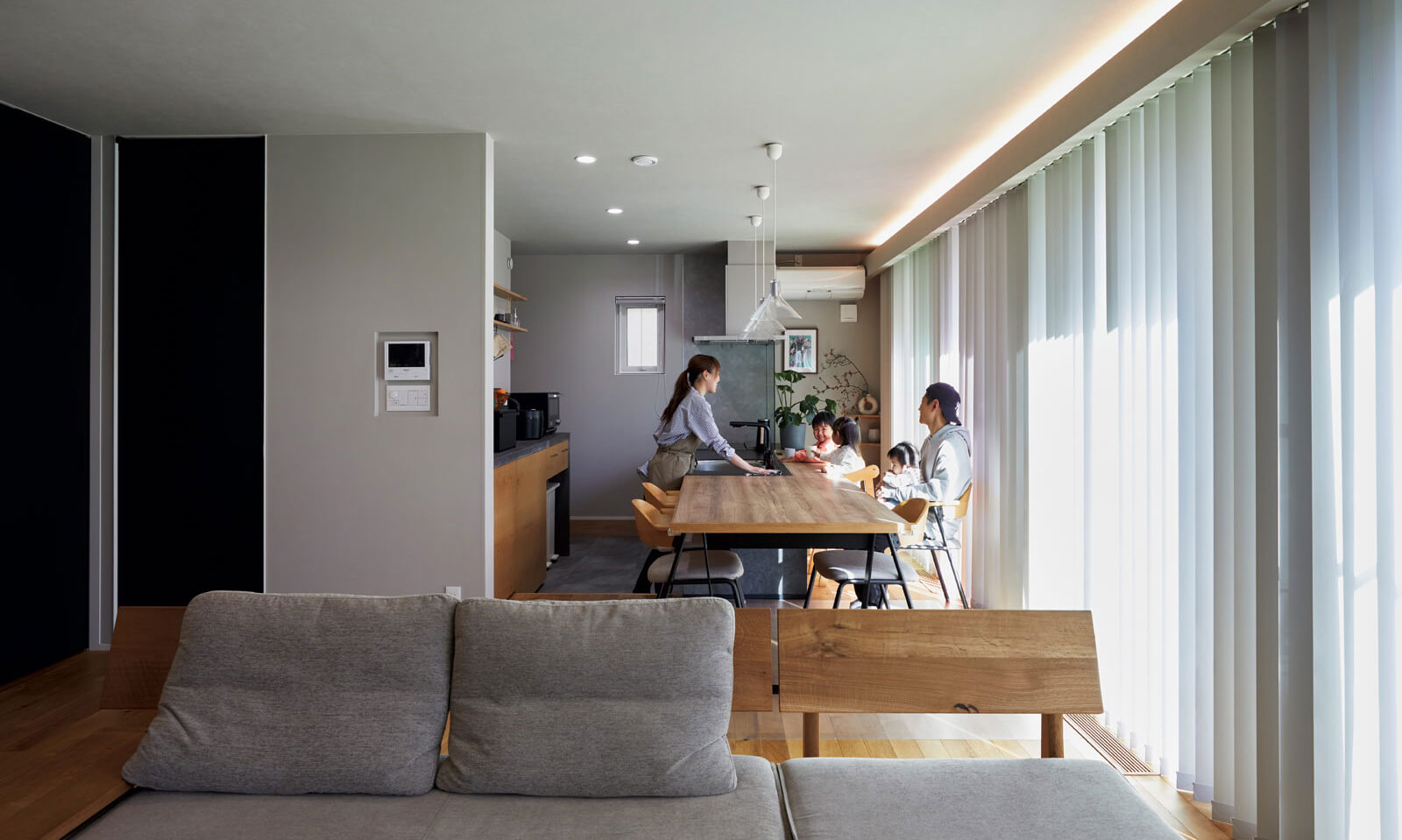 家族が集う大空間LDK、生活に合わせた家事動線、多彩な造作家具、豊富な収納など、暮らしに寄り添った工夫・アイデアが盛りだくさんです。住まいへの夢を叶えたご一家は、家族5人の暮らしを満喫しています。