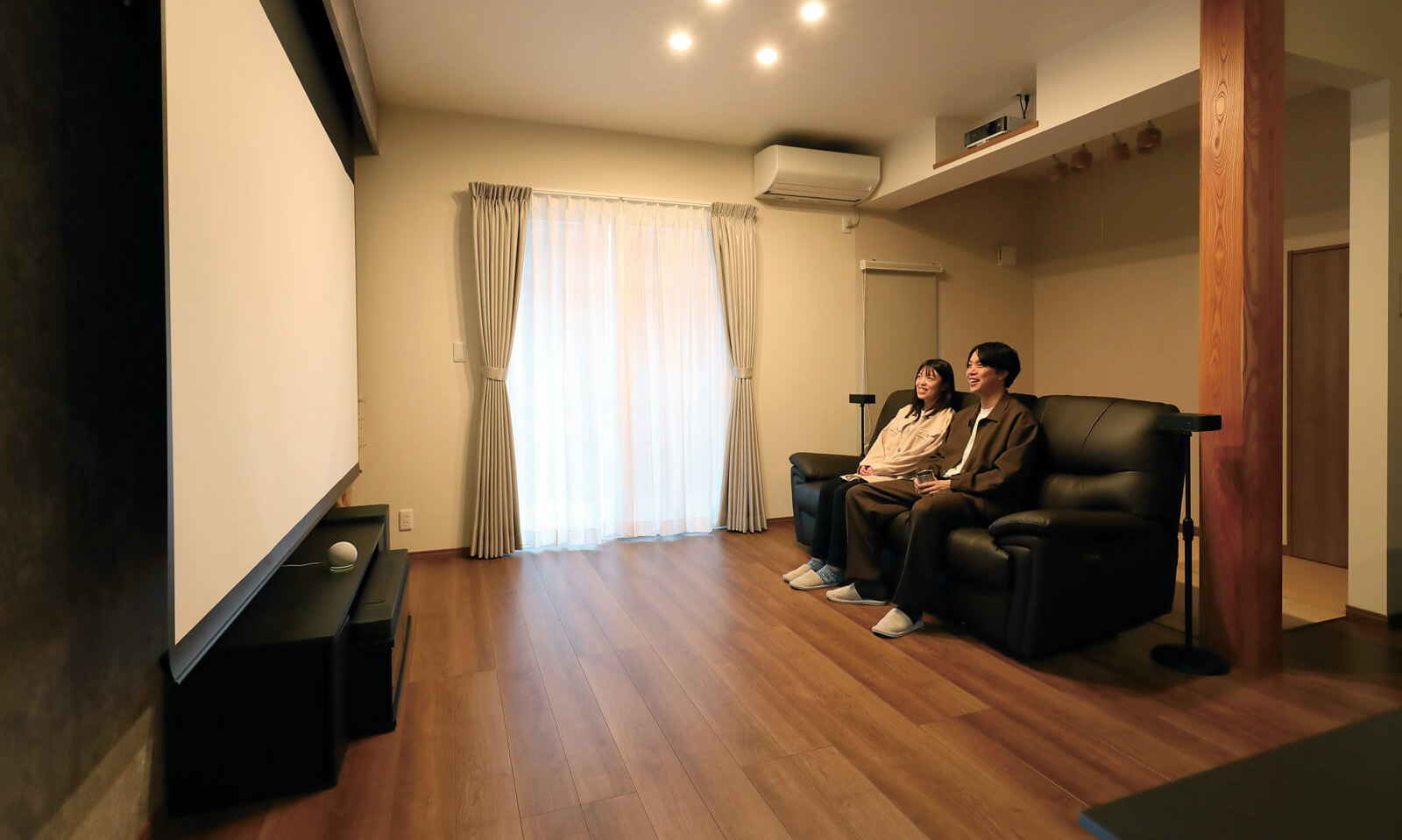 「引っ越して間もないですが、家事が時短できて自由な時間が増えました」とHさん。あまり映画に興味がなかった奥さんは「リビングで一緒にゆっくりと鑑賞したい」と、心境の変化を語ります。信頼関係で結ばれた工務店とともにつくり上げたご夫妻の「理想の家」。始まったばかりのここでの暮らしに、希望と期待が膨らんでいます。