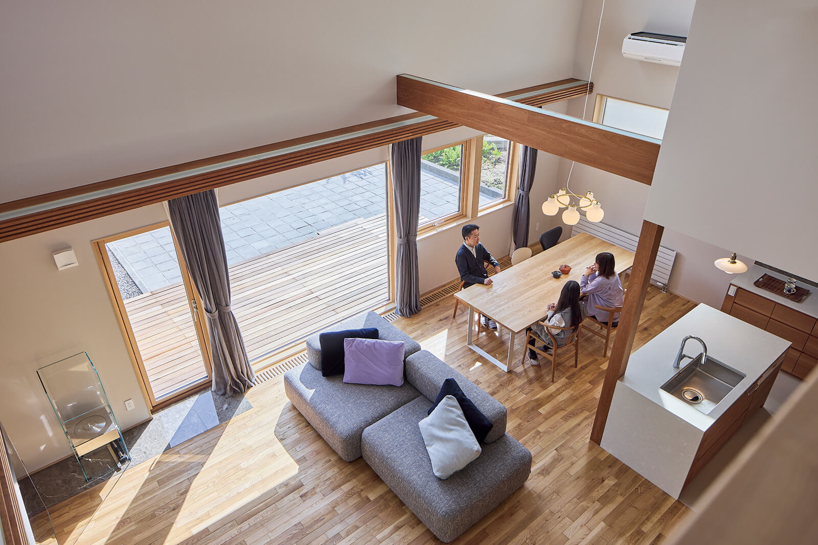 家族が集う大きな吹き抜けのあるLDKは、窓の向こうに隣家の緑が映え、ハイサイドライトが青空を切り取る開放的な大空間。「ここが住宅街であることを忘れてしまいそう」と、周辺環境を読み解き、土地のポテンシャルを最大限に引き出す設計がTさんご一家に新鮮な喜びをもたらしています。