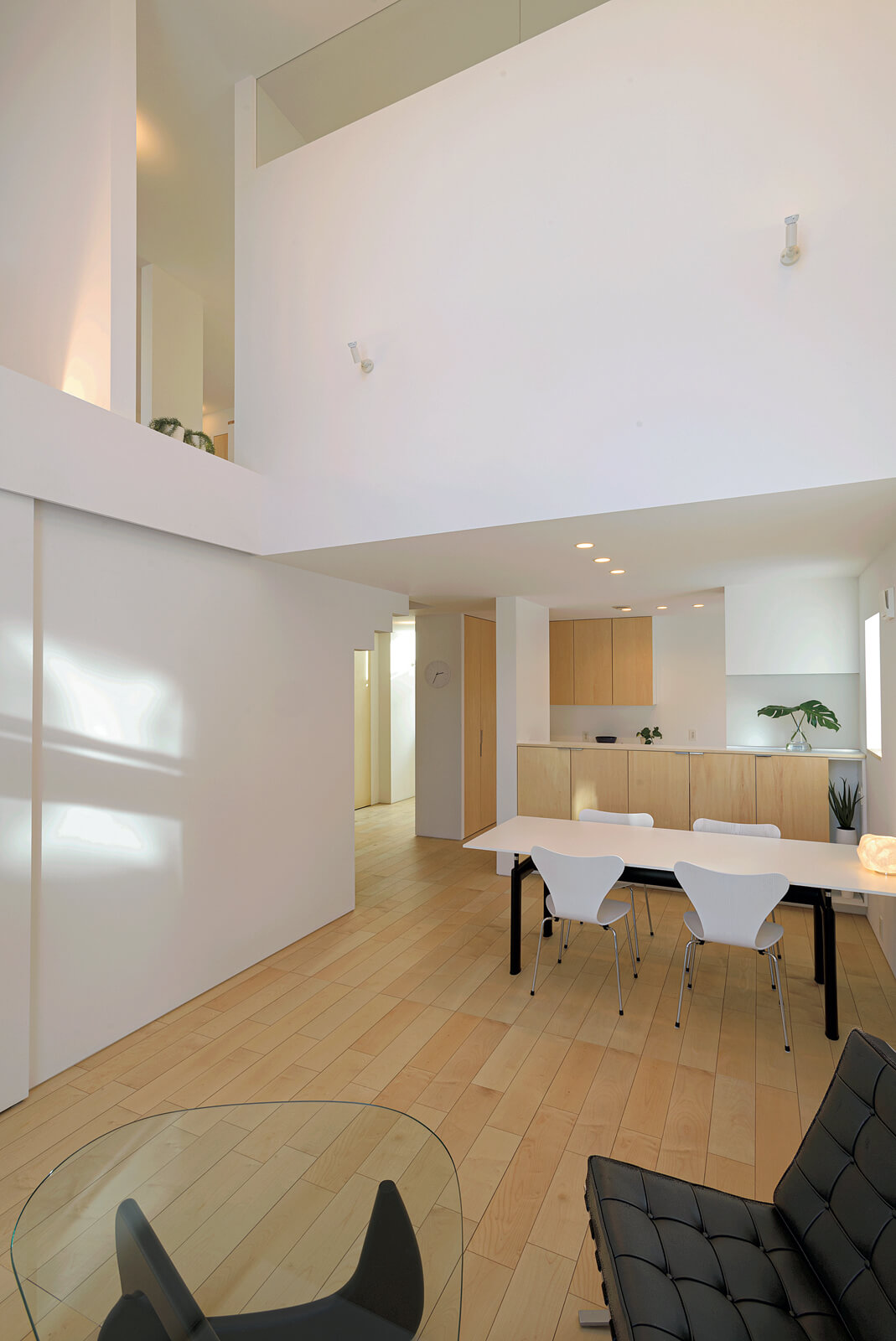 屋内は明るめのフローリングと白い塗り壁で統一。吹き抜けのリビングには天井まで続く3連窓を北側に配置し、一年中、均一なやわらかい光を室内に運び込んでいます。リビングから空を望むことができ、2階の洋室や階段部へと視線が抜けることで、開放感に包まれて過ごせます。